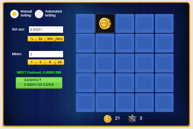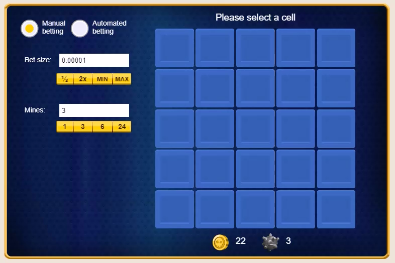 - Игрок выбирает ставку и количество мин от 1 до 24.