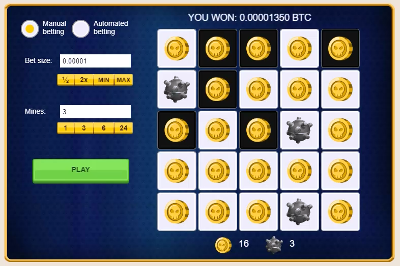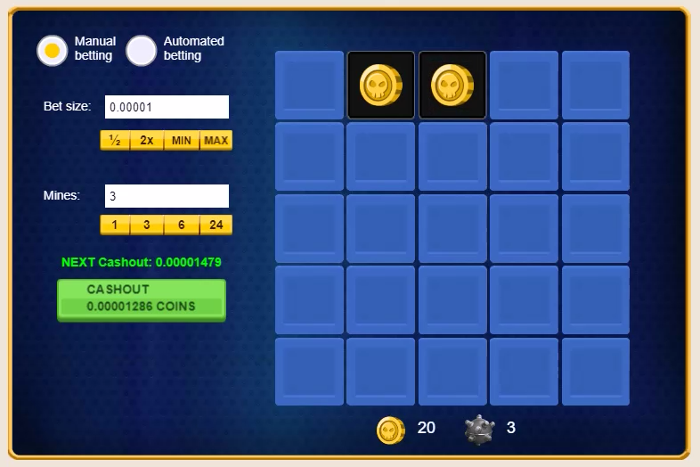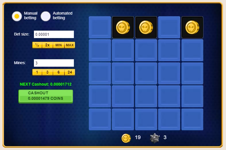 - В противном случае, если игрок выбрал клетку, на которой нет шахты (обозначенной эмблемой Биткоина), то его ставка увеличится.
