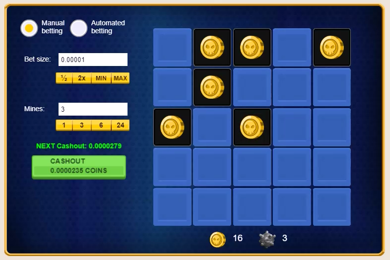 На этой странице рассматривается версия игры «Сапер», часто встречающаяся в интернет-казино и полностью основанная на криптовалютах. Игра ведется на сетке 5x5. Цель — выбрать клетки на сетке, на которых нет мины. Не следует путать эту версию с данной версией игры.