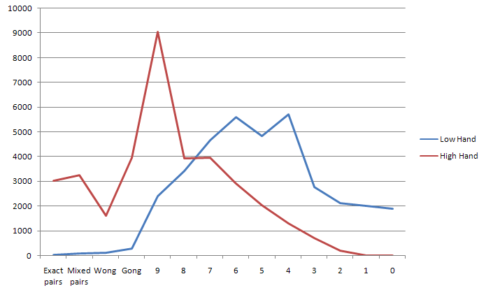 - Если и у игрока, и у дилера есть Вонг, Гонг или от 1 до 9 очков, ничья разрешается в зависимости от того, у кого из игроков окажется старшая фишка более высокого ранга.