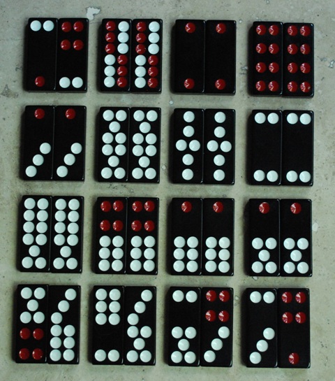 - В пай-гоу играют с набором из 32 домино, изображенных ниже.