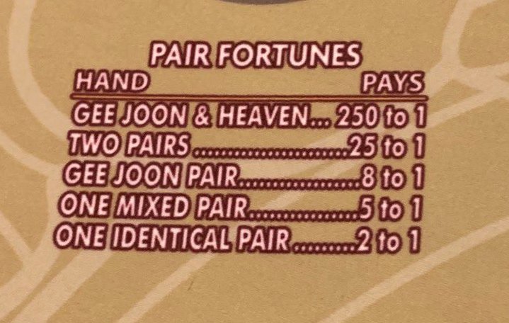 «Парные ставки» — одна из немногих дополнительных ставок, доступных для игры в пай-гоу. Если игрок соберет хотя бы одну пару, он выигрывает. За две пары он выигрывает еще больше. Насколько мне известно, существует три таблицы выплат для этой игры, а именно: