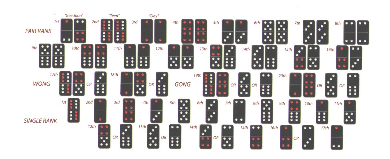 В некоторых сводах правил казино указано, что значение фишки 2-4 выше двух пятерок, в то время как в других она ставится на последнее место вместе с фишкой 1-2. В моем собственном объяснении правил я ставлю ее на последнее место. Так почему же такое расхождение? Согласно Джону Гвинну, который цитирует Майкла Мусанте в своей статье «Подробное исследование Пай Гоу» (страница 308), опубликованной в книге «В поисках преимущества» , существует неписаное правило, согласно которому фишка 2-4 занимает место чуть выше пятиочковых фишек (1-4 и 2-3), за исключением случаев, когда она используется для подсчета трех очков, в этом случае она ставится на последнее место вместе с фишкой 1-2. Это понижение в ранге имеет значение только тогда, когда фишка «Ги» сочетается с любой из пятиочковых фишек (1-4 или 2-3). В этом случае она рассматривается как три очка, понижая свой ранг ниже пятиочковой фишки. Таким образом, по сути, обе фишки «Ги» должны быть и фактически занимают последнее место в ранге.