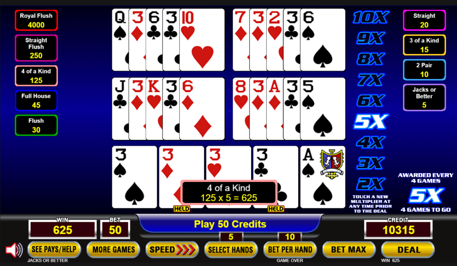 В предыдущей раздаче я выбрал множитель 5x. Когда настала моя очередь получить множитель, мне раздали две тройки, которые я и сохранил. В предыдущей раздаче у меня собралась каре, которая обычно приносит 125 кредитов при ставке в 5 кредитов. С множителем 5x мой выигрыш составил 5×125 = 625 кредитов.