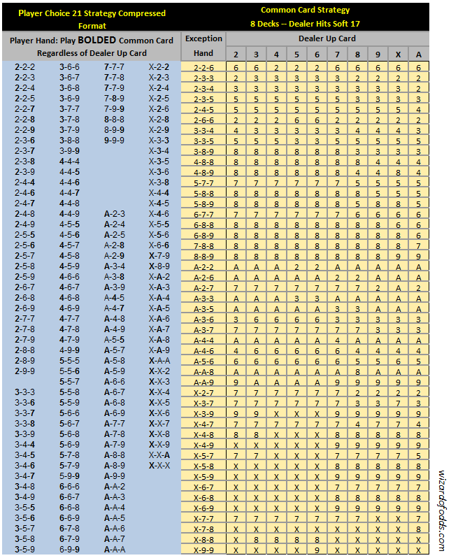 В следующей таблице показано, какую карту следует разыграть в качестве общей карты в зависимости от трех карт игрока и открытой карты дилера. Эта таблица предназначена для игры "взять карту при мягкой 17", но также хорошо подойдет и для игры "остановиться при мягкой 17".