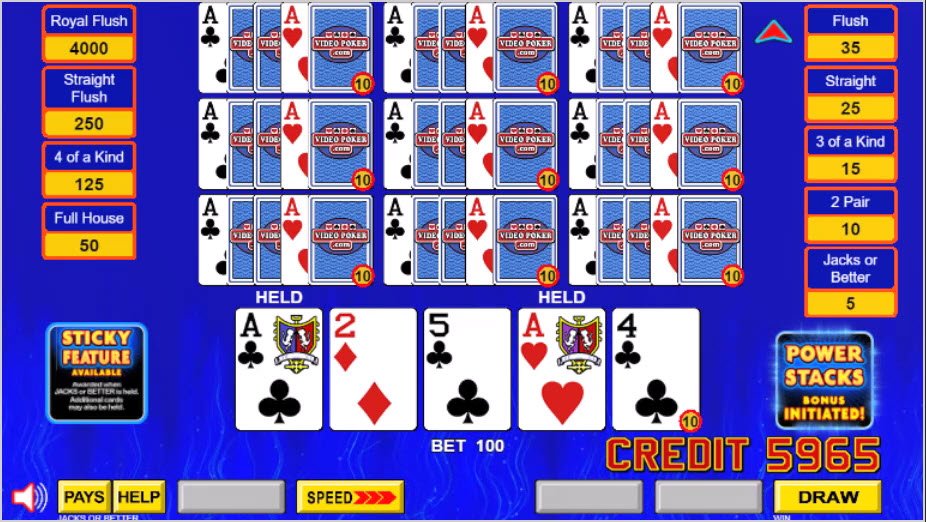 Power Stacks Poker — это разновидность видеопокера, в которой игрок может заработать дополнительные комбинации с «липкими картами», если ему раздадут определенные руки при раздаче.