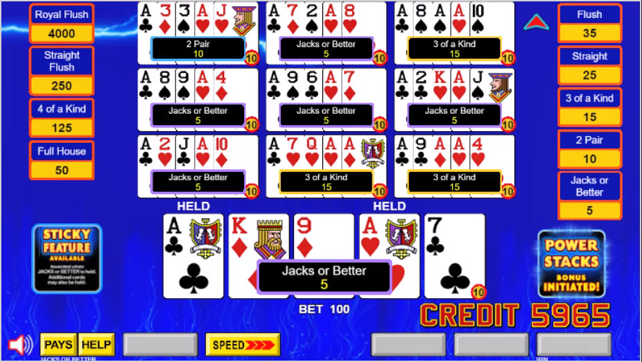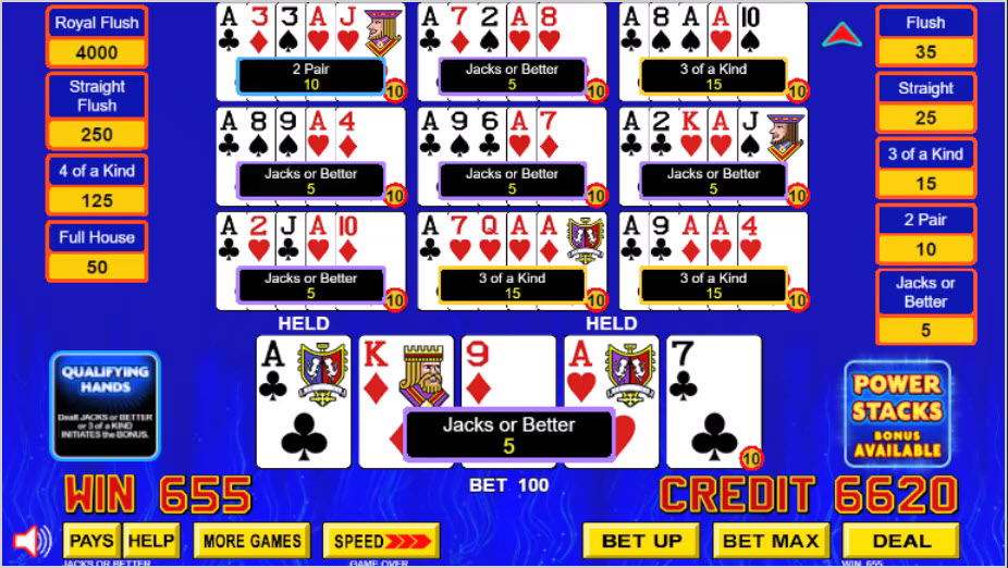 - Если функция Power Stacks включена, игрок будет использовать её, если ему выпадет пара валетов или лучше, либо три одинаковые карты.