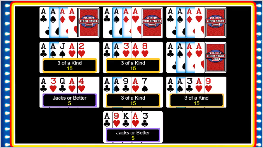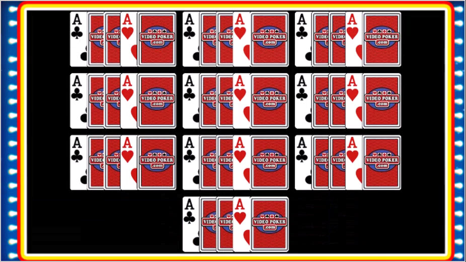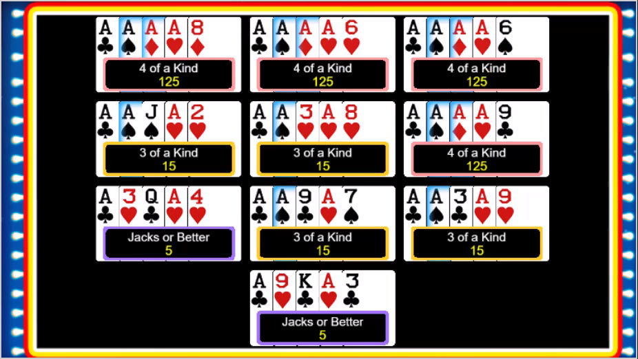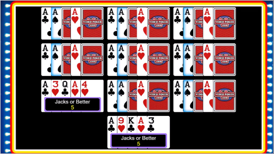 В приведенной выше раздаче я играю в Jacks or Better с 10 ходами и включенной функцией. Обратите внимание, что таблица выплат была повышена до 10-7-5. При раздаче мне выпала пара тузов, которые я и получил.