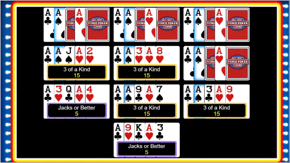В 10 раздачах, за которые я заплатил, моя пара тузов один раз превратилась в две пары, а три раза — в три одинаковые карты. Исходя из ставки в 5 монет за игру, общий выигрыш по этим раздачам составляет 5 * (6*1 + 1*2 + 3*3) = 85.