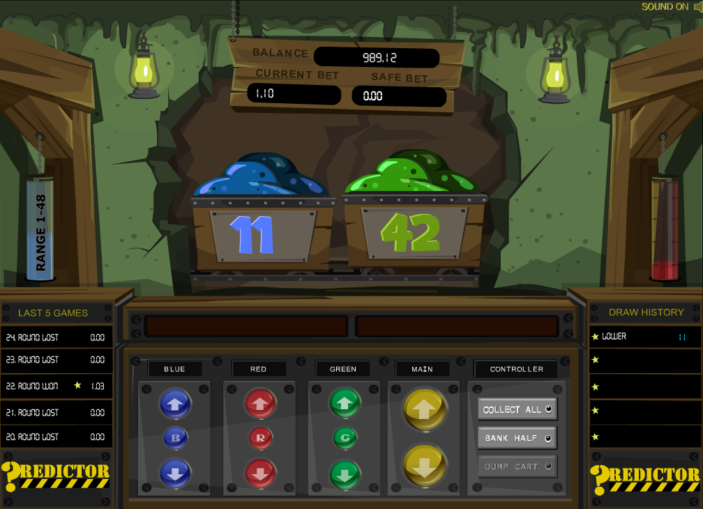 - Игрок может выйти из игры или «забрать половину средств» в любой момент. Это означает, что он забирает половину текущего баланса, а другую половину ставит на кон.