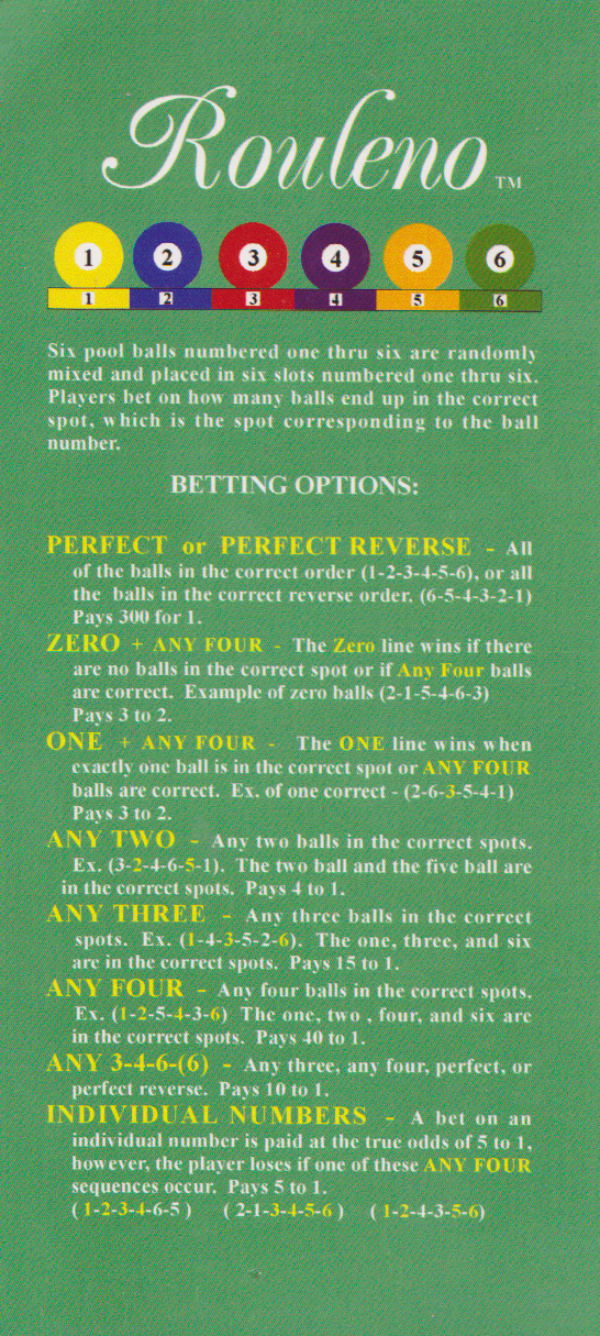 Впервые я увидел Roulino в казино Max в Лас-Вегасе 20 октября 2016 года. Название и сама игра представляют собой гибрид рулетки и кено. Игра основана на вытягивании шести бильярдных шаров, пронумерованных от одного до шести, и на том, сколько раз номер шара совпадает с порядком его вытягивания.