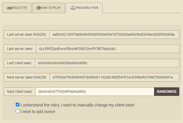 Вы сами решаете, добавлять ли Nonce — дополнительные автоматические символы, добавляемые в конец клиентского сид-кода. Я считаю, что если бы казино намеревалось обмануть, добавление Nonce не обеспечило бы никакой защиты.