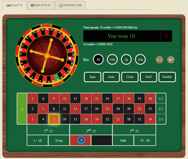 В игре на Crypto.Games рулетка играется на колесе с одним нулем, как это обычно бывает в онлайн-казино. Преимущество казино составляет 1/37 = 2,70% на каждую ставку.Честная игра