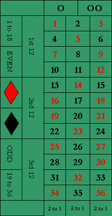Как и в случае с нулём и двойным нулем, все ставки с равными шансами проигрывают, если шарик попадает на зелёную зону. Порядок чисел от 1 до 36 такой же, как в рулетке с одним нулем. Цифры 0, 00 и логотип идут подряд, причём логотип находится посередине.