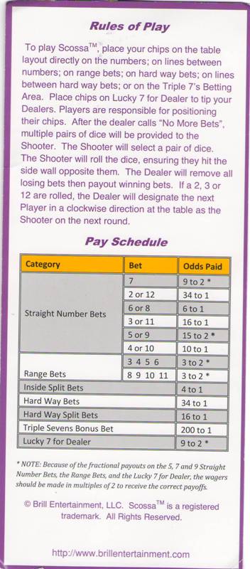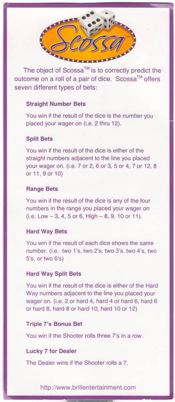 Скосса — это игра в кости, которую я заметил в отеле Red Rock в Лас-Вегасе 17 мая 2011 года. Стол в тот момент был закрыт, но, к счастью, у них были доступны карточки с правилами. Если я не ошибаюсь, «скосса» по-итальянски означает «бросать», то есть бросать кости.