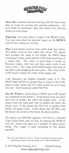 Show Pai — это довольно простая настольная игра, сочетающая в себе подсчет очков баккары и формат пай гоу . Игра дебютировала в отеле Palace Station в Лас-Вегасе в начале 2016 года. Игра проста в освоении и применении, а также предлагает сравнительно низкое преимущество казино.