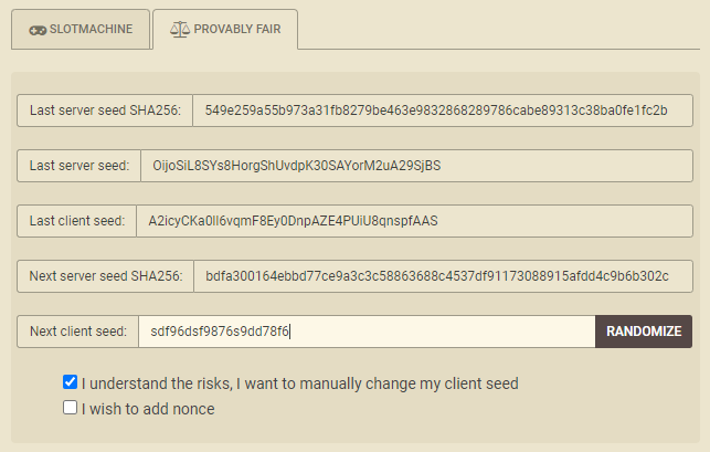 На изображении выше, взятом из панели Provably Fair, я выбрал свой собственный Client Seed. Затем я скопировал и вставил в другое место Server Seed и Hash Client Seed, обозначив их как "Next server seed SHA256". В данном случае это: