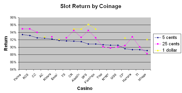 В следующей таблице перечислены все казино, в которых я обнаружил хотя бы один игровой автомат с видеоэкраном, отображающим четверть доллара или доллар. В таблице показаны выплаты по никелю, четвертям и долларам, отсортированные по выплатам по никелю. Вы заметите, что в некоторых казино выплаты немного снижаются при переходе от никелей к четвертям. Это связано с вариативностью выборки. Некоторые типы автоматов, как правило, выплачивают больше, чем другие, а автоматы с выплатами по четвертям обычно являются более скупыми. Выплаты по никелю, указанные здесь, могут не совпадать с данными в Приложении 3A . Это связано с тем, что Приложение 3A отражает некоторые обновленные результаты, а данное приложение — нет.