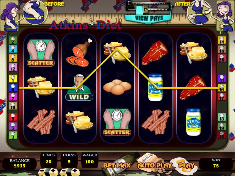 В следующей таблице представлена таблица выплат по диете Аткинса. Все выигрышные комбинации должны быть выровнены по левому краю. Символ Аткинса является диким символом и может заменять любой символ, кроме весов.