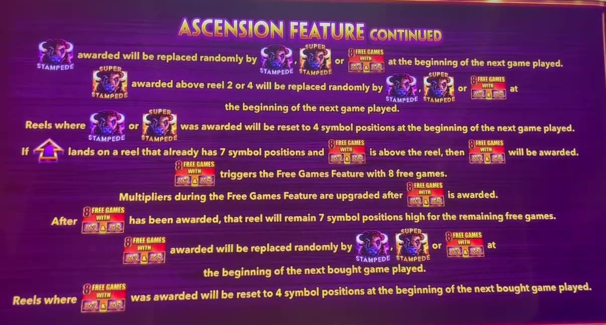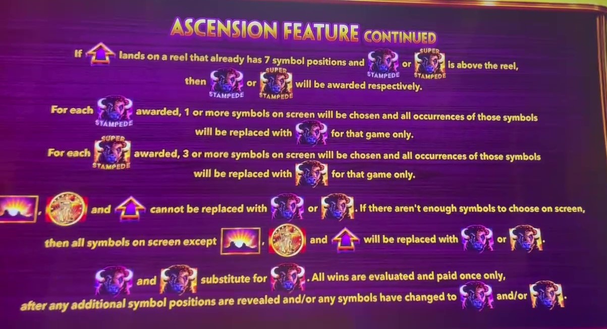 Buffalo Ascension — одна из многих игр на тему буйволов. Отличительной особенностью этой игры является то, что количество позиций на барабанах со 2 по 4 может варьироваться от 4 до 7. Чем больше стопок символов, тем больше способов выиграть и тем ближе вы к бонусному раунду.