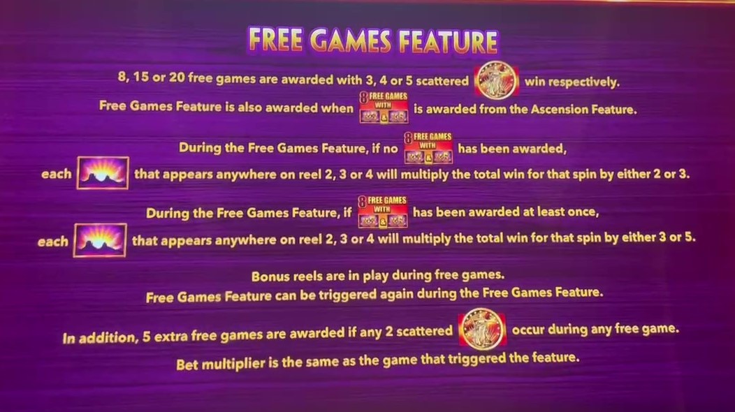 - В режиме бесплатных вращений символ восхода солнца, помимо того, что является диким символом, также имеет множитель 2x или 3x, который применяется ко всем выигрышам в этом вращении. За исключением случаев, когда игрок повторно запускает бонус с 3-5 золотыми монетами, тогда множитель дикого символа будет равен 3x или 5x для всех оставшихся вращений.