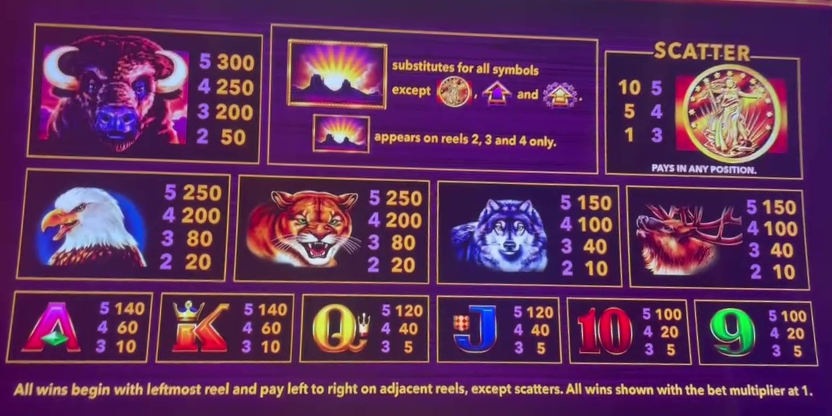 - Символами, обозначающими выплаты по линиям выплат, являются буйвол, орёл, пума, волк, олень, буквы A, K, Q, J, 10 и 9.