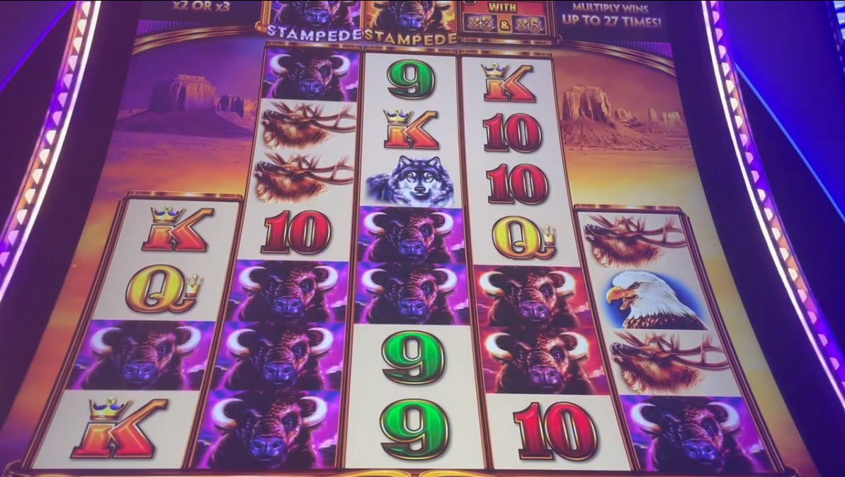 Вот пример правила «способов выигрыша». На изображениях ниже (после «Стампид») на барабанах с 1 по 5 изображены 1, 4, 2, 2 и 1 буйвол соответственно. Таким образом, получается 1×4×2×2×1 = 16 способов выигрыша. Пять буйволов приносят 300 кредитов, поэтому общий выигрыш составил 16 × 300 = 4800 кредитов, или 48 долларов.