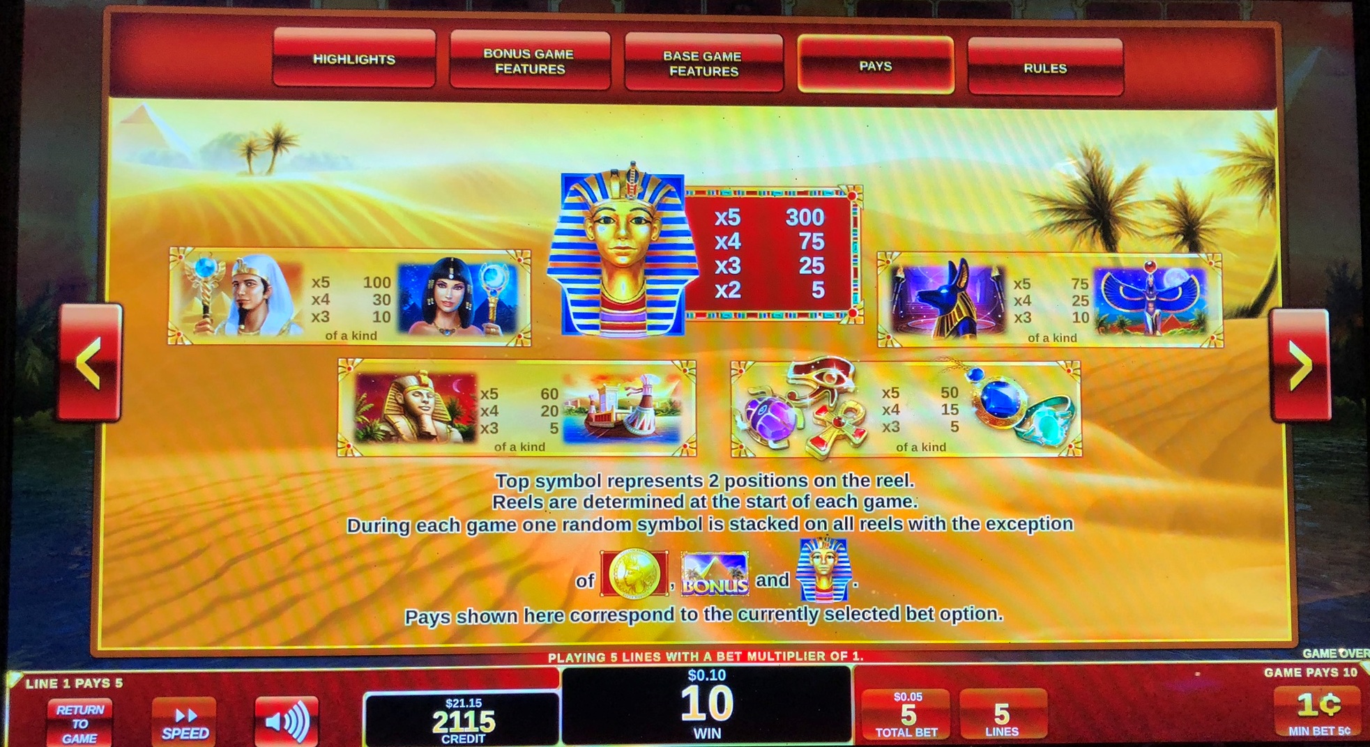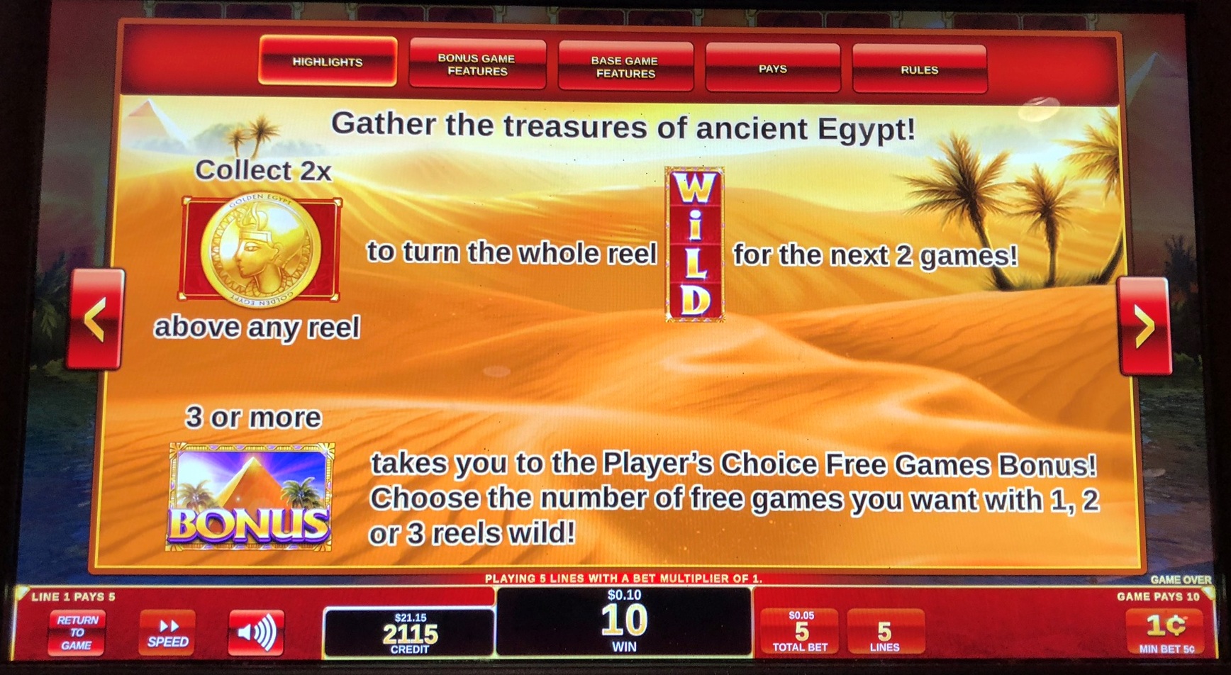 Golden Egypt — это игровой автомат от IGT, который некоторые называют «игровым автоматом с переменным состоянием». Его особенность заключается в том, что символы монет, зарабатываемые за игру, превращают барабаны в полностью дикие символы. Если предыдущий игрок покидает игру, имея достаточно монет, шансы временно меняются в пользу следующего игрока.