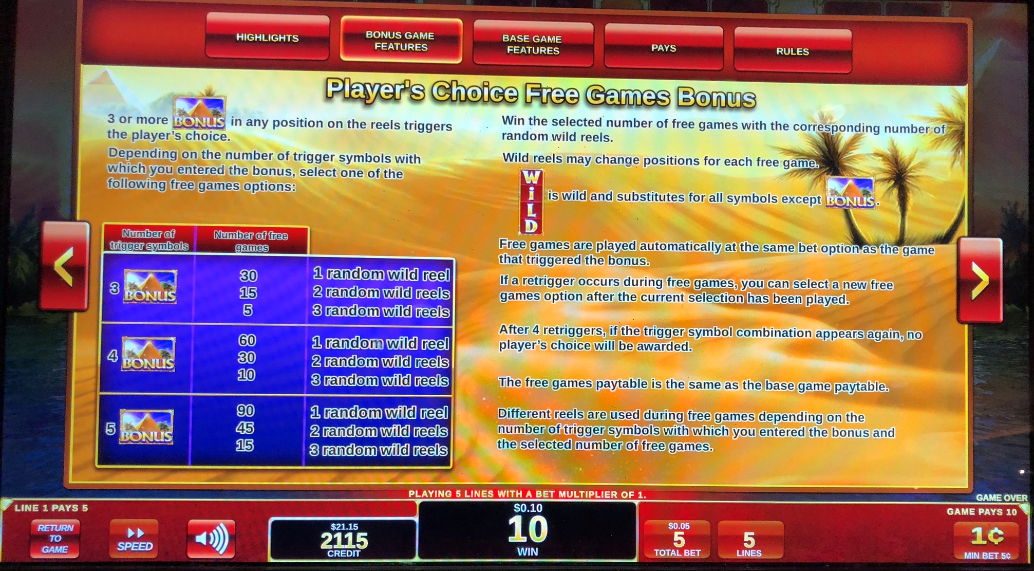 - Если на экране появятся три или более символов пирамиды, игрок начнет бонусную игру с бесплатными вращениями и случайными дикими символами на барабанах.