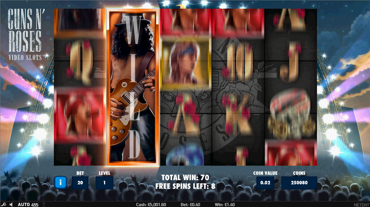 В игре GNR на начальных вращениях часто встречаются расширяющиеся вайлды. Для тех, кто не знаком с этим термином, это означает, что если вайлд появляется где угодно, он расширяется и покрывает все позиции на этом барабане. В GNR на начальных вращениях присутствуют как расширяющиеся, так и нерасширяющиеся вайлды.