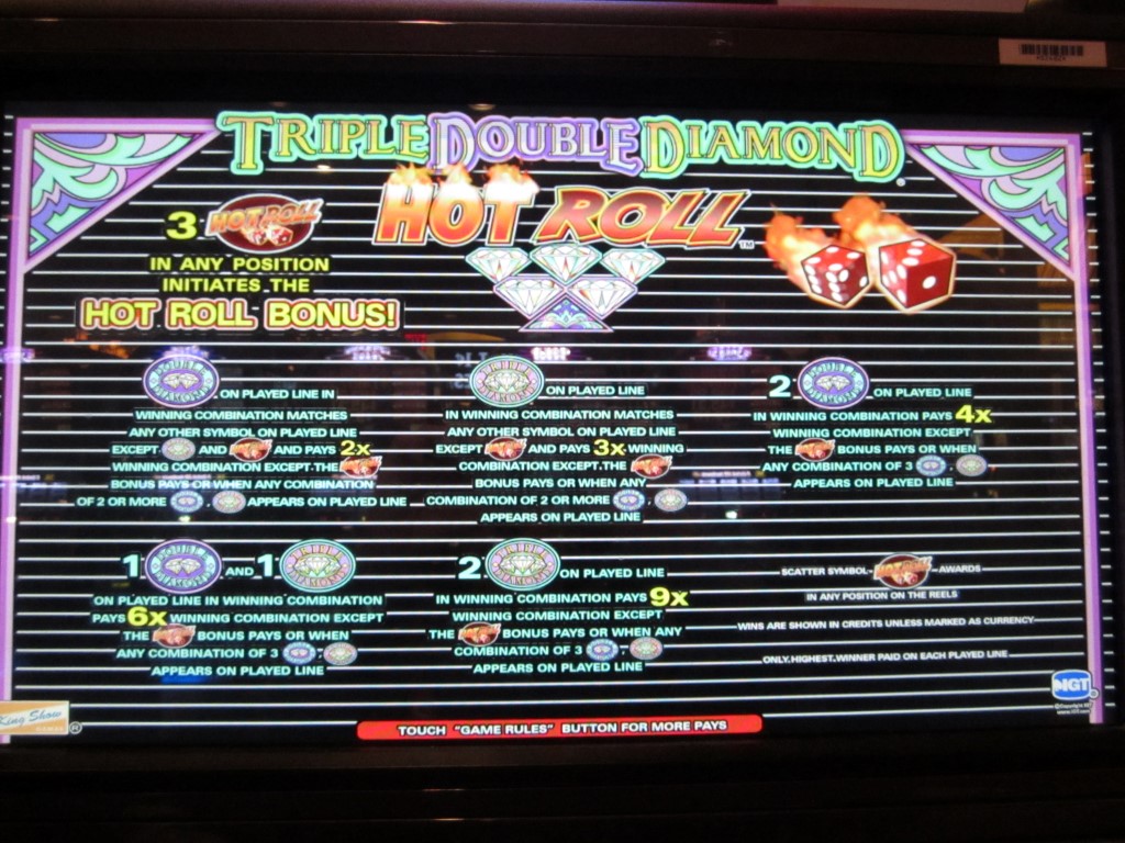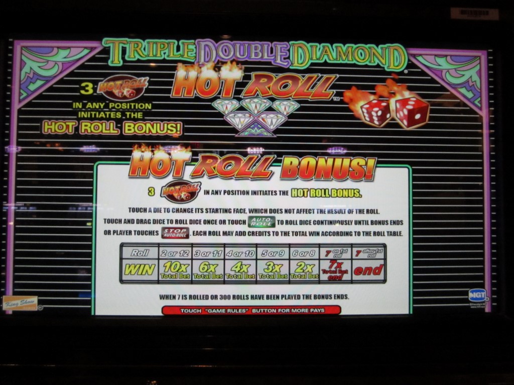 Hot Roll — это бонусная функция, добавленная в различные 3-барабанные игровые автоматы от компании IGT . В данном анализе она основана на классической игре Triple Double Diamond. Если игрок получает символ Hot Roll на всех трех барабанах, он начинает бонусную игру, основанную на игре в кости. В этой игре игрок бросает две кости и выигрывает деньги, пока не выбросит семерку, после чего бонусная игра завершается.