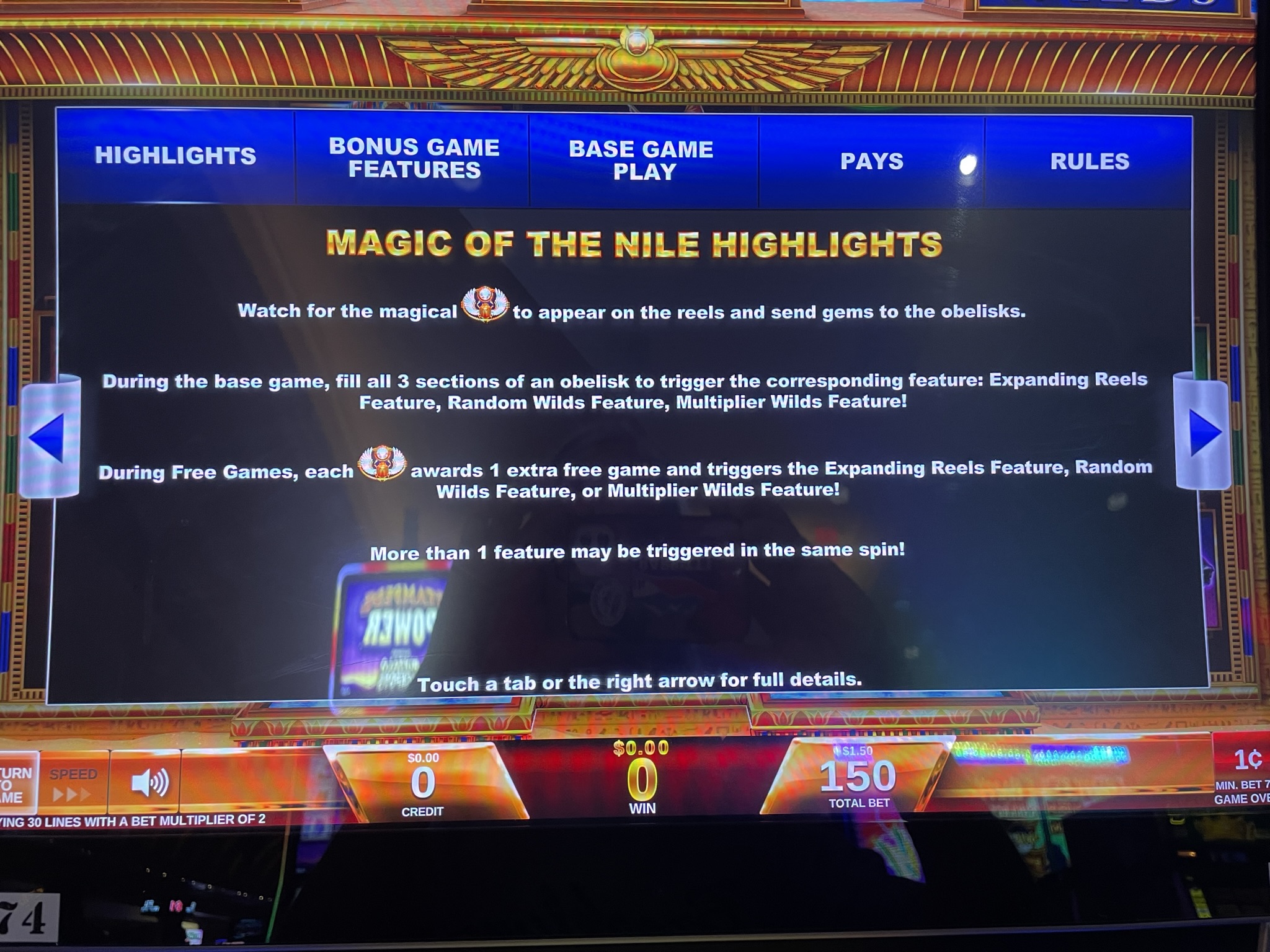 Magic of the Nile — это игровой автомат с изменяемым состоянием, который иногда предоставляет игроку преимущество. Суть игры заключается в том, что игроки вкладывают средства в сбор драгоценных камней. Эти камни могут быть красными, синими или зелеными. Когда игрок собирает три камня одного цвета, он запускает бесплатный бонусный спин, который обычно приносит выигрыш от 10 до 25 раз больше ставки.