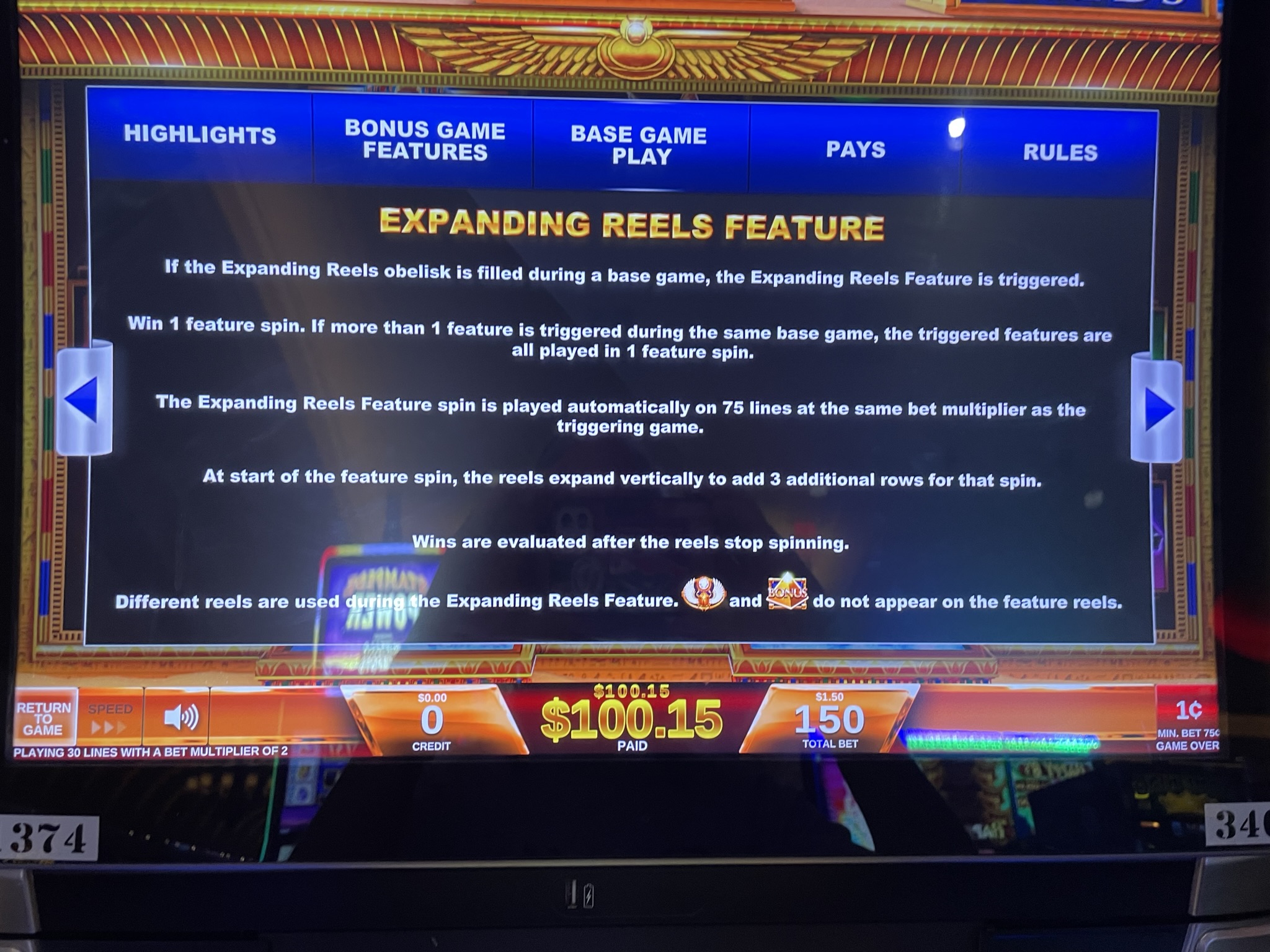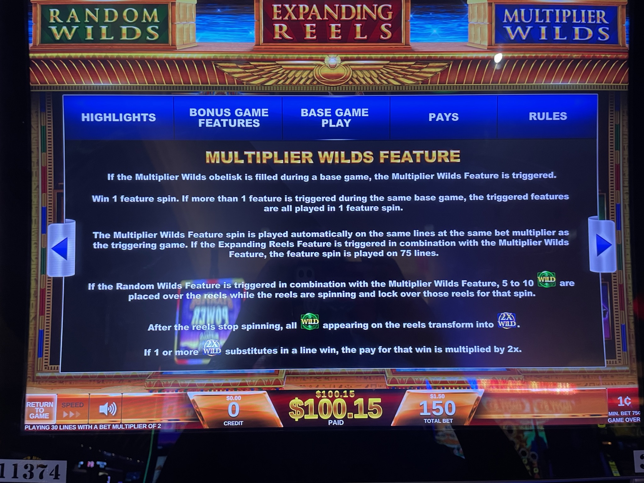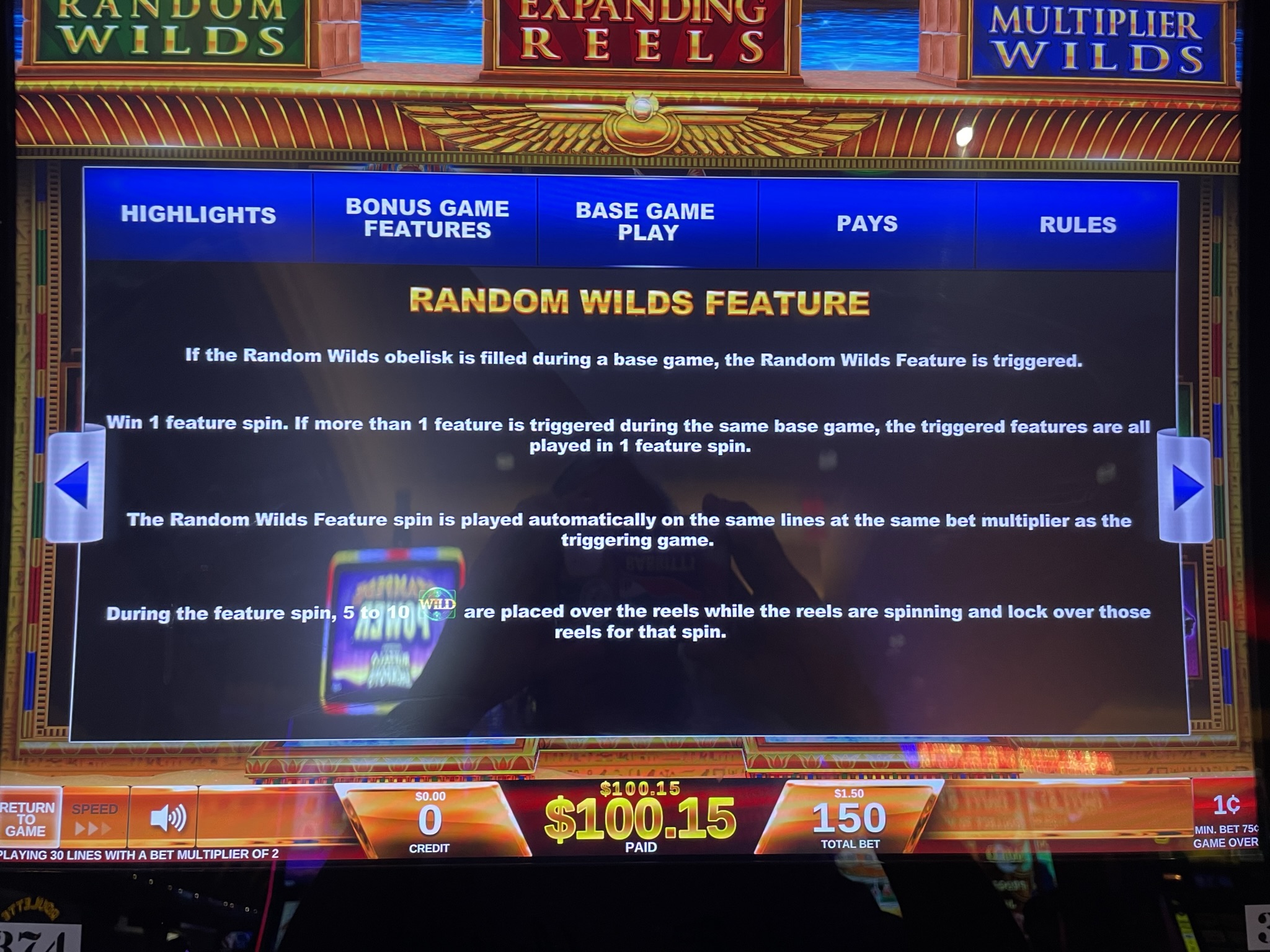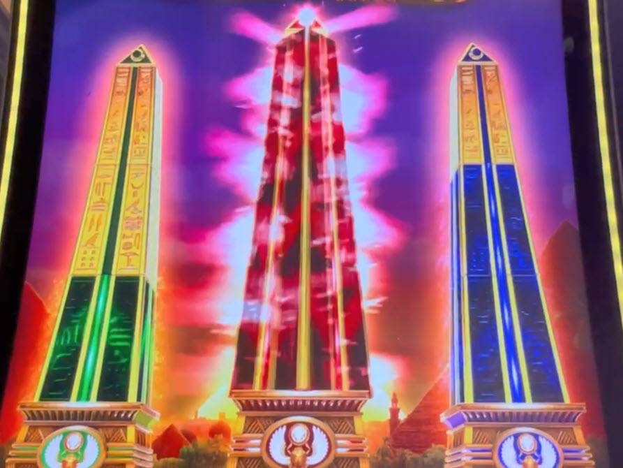 За получение всех трех частей красного обелиска игрок получит бонусный спин с эффектом случайных диких символов. В этом спине барабаны расширяются с трех рядов до шести. Что еще важнее, количество линий выплат увеличилось с 30 до 75. Я почти уверен, что также используется более щедрая процедура удаления символов с барабанов.
