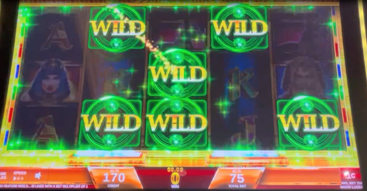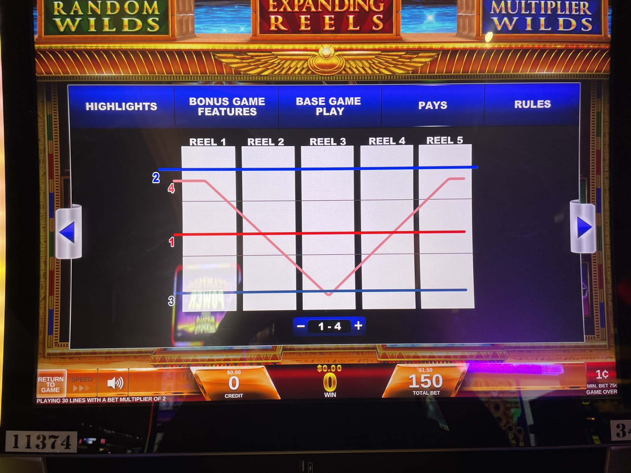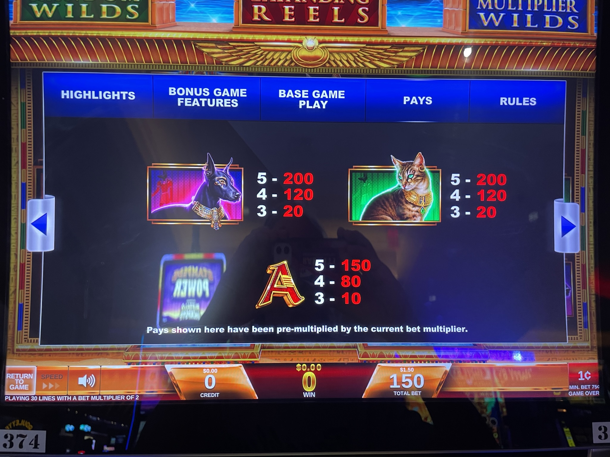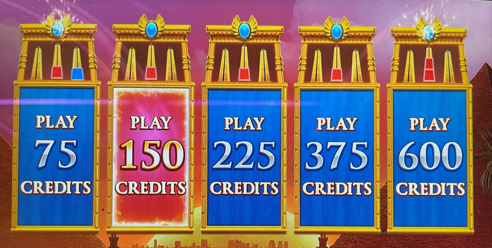 Игра предлагает пять различных уровней ставок. Каждый из них представляет собой отдельную игру, находящуюся в отдельном состоянии. К счастью для любителей игровых автоматов, на панели ставок отображается количество подсвеченных элементов каждого обелиска на всех пяти уровнях. Еще больше упрощает задачу, показывая, как драгоценный камень над обелиском сверкает, как бриллиант, если подсвечено хотя бы два элемента. Например, на изображении ниже уровни ставок $0,75 и $6,00 имеют по два подсвеченных элемента, и драгоценный камень над этими обелисками сверкает.