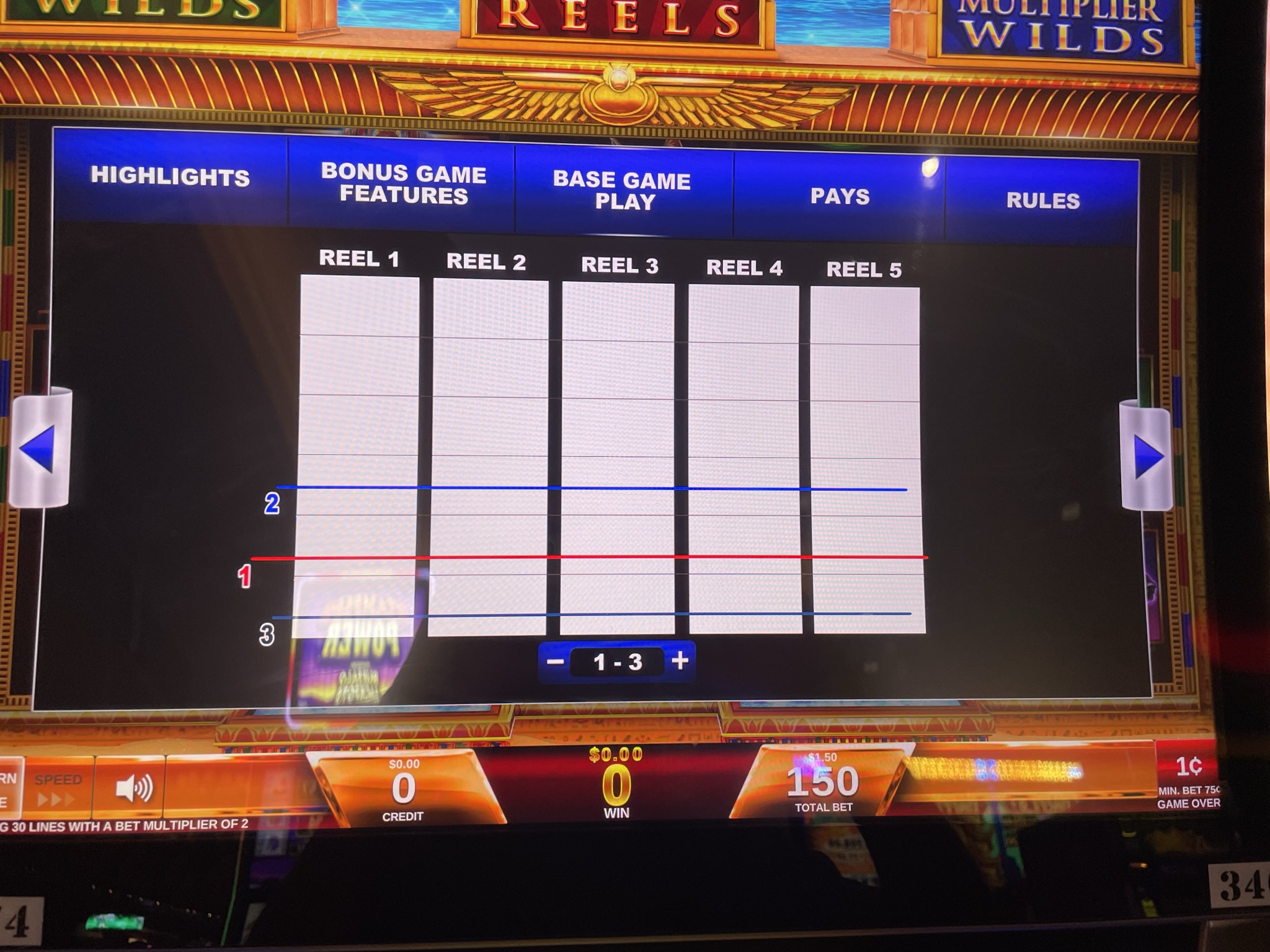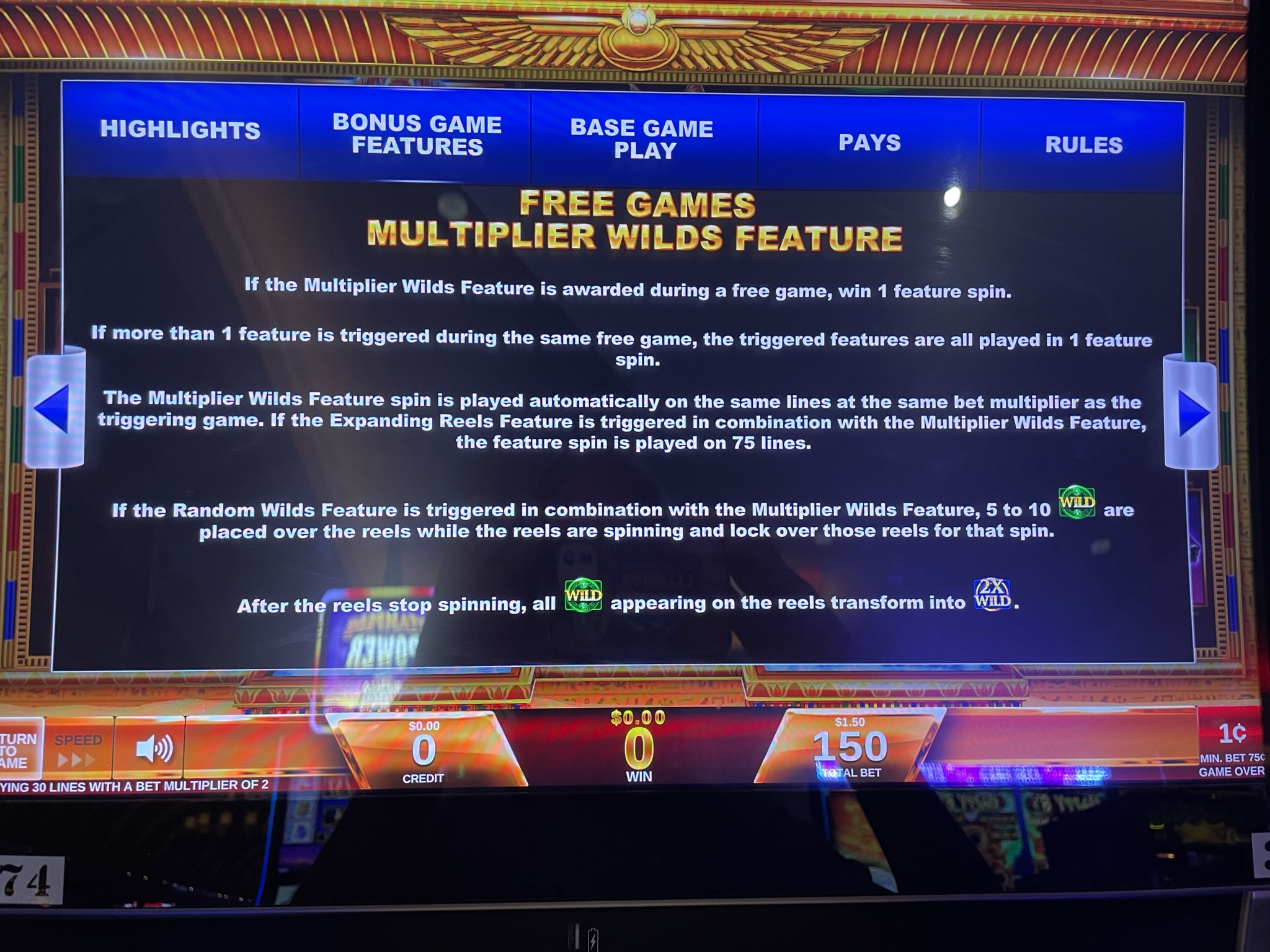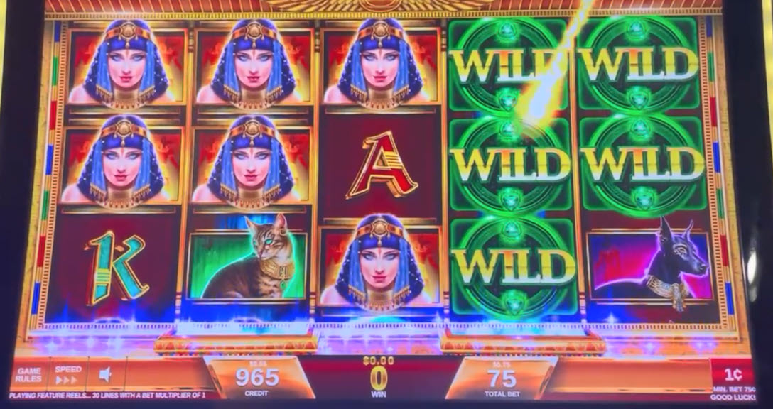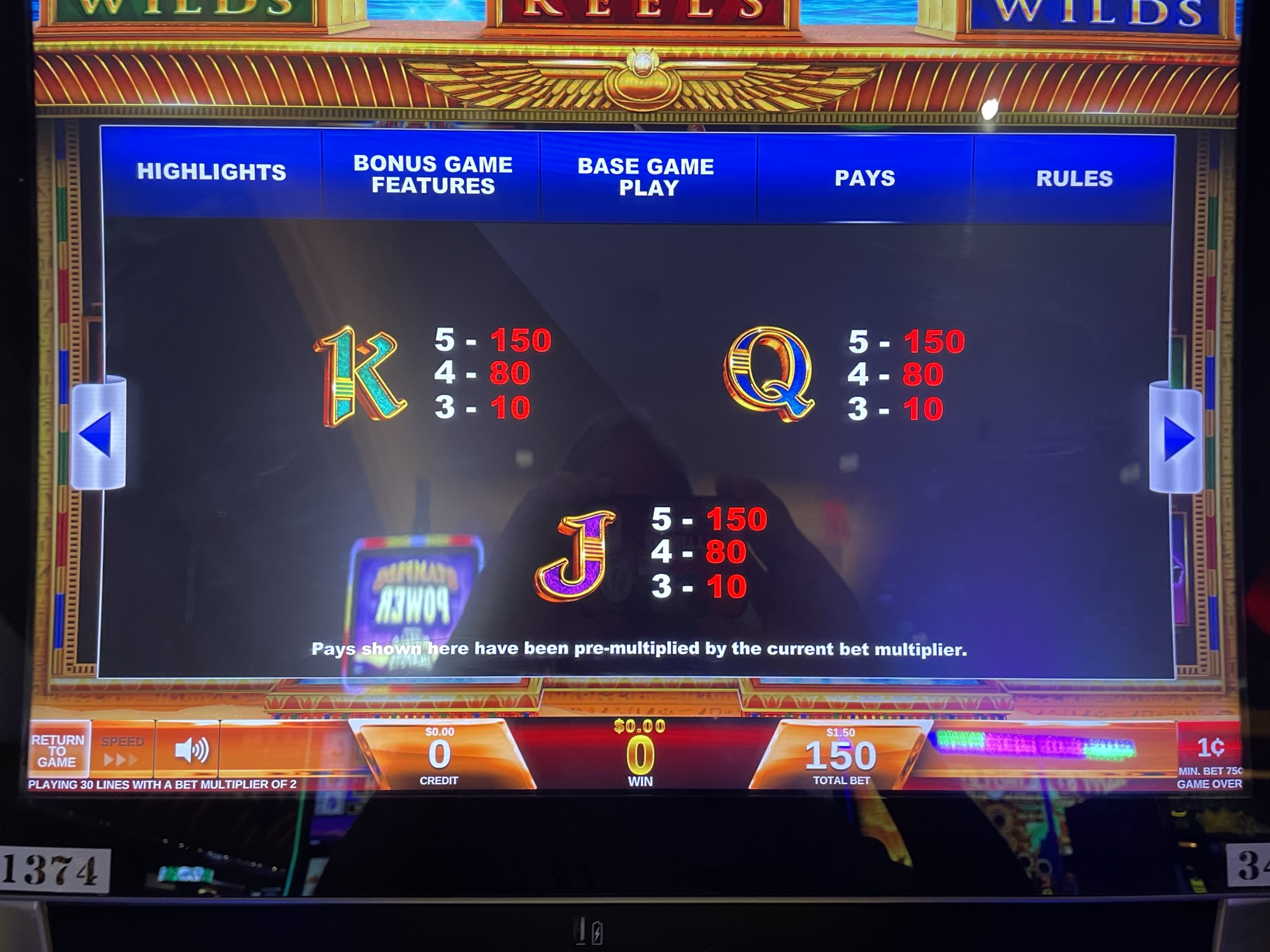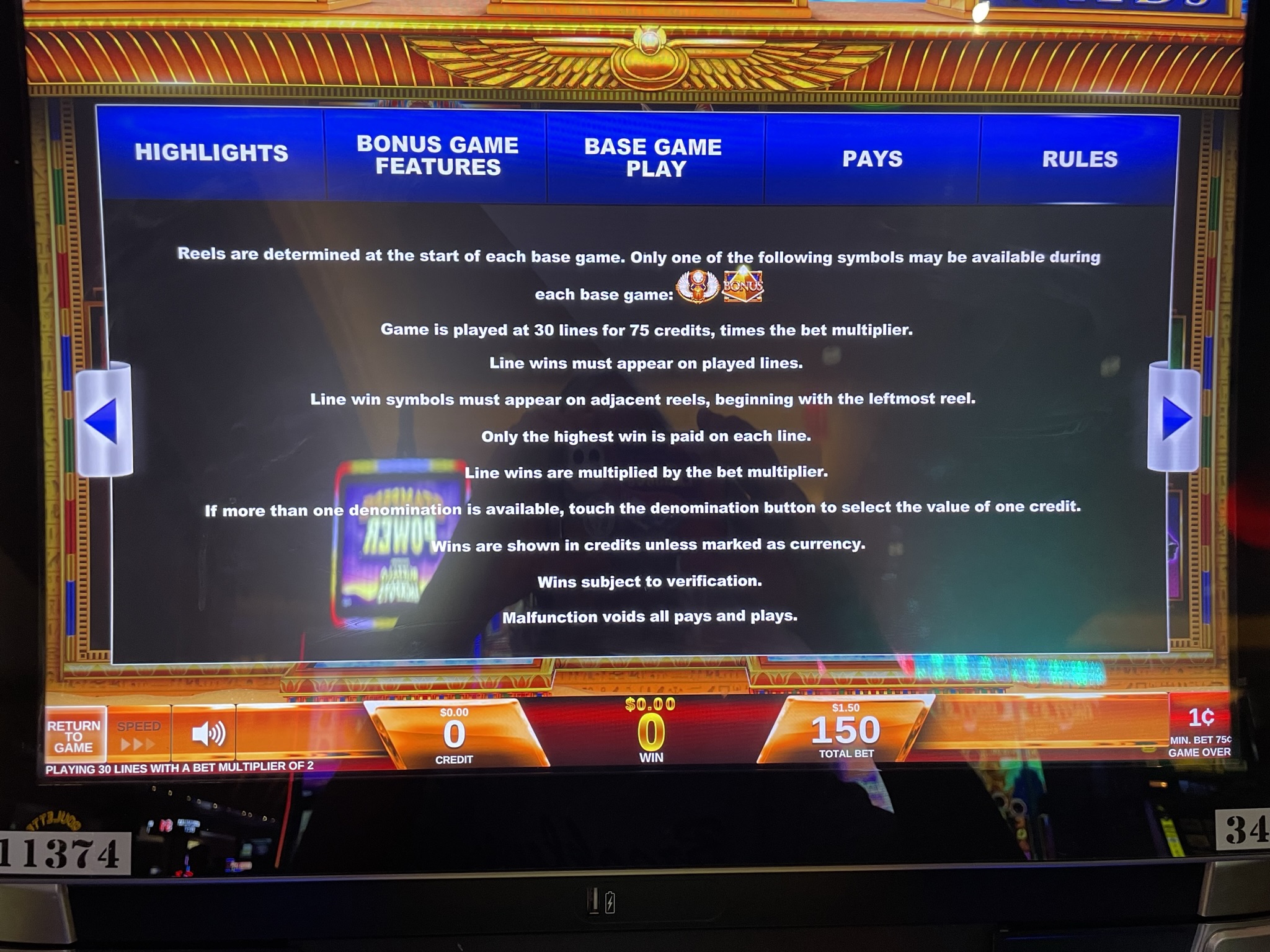 Игра предлагает пять различных уровней ставок. Каждый из них представляет собой отдельную игру, находящуюся в отдельном состоянии. К счастью для любителей игровых автоматов, на панели ставок отображается количество подсвеченных элементов каждого обелиска на всех пяти уровнях. Еще больше упрощает задачу, показывая, как драгоценный камень над обелиском сверкает, как бриллиант, если подсвечено хотя бы два элемента. Например, на изображении ниже уровни ставок $0,75 и $6,00 имеют по два подсвеченных элемента, и драгоценный камень над этими обелисками сверкает.