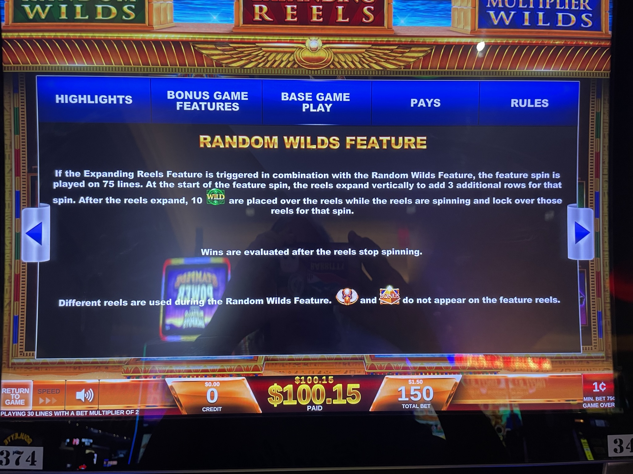 В приведенном ниже примере вы можете увидеть, как барабаны расширяются до шести рядов. Мой общий выигрыш составил 18 долларов, исходя из ставки в 0,75 доллара, или в 24 раза больше суммы первоначальной ставки.