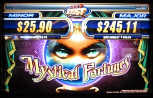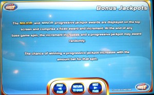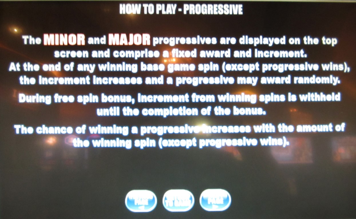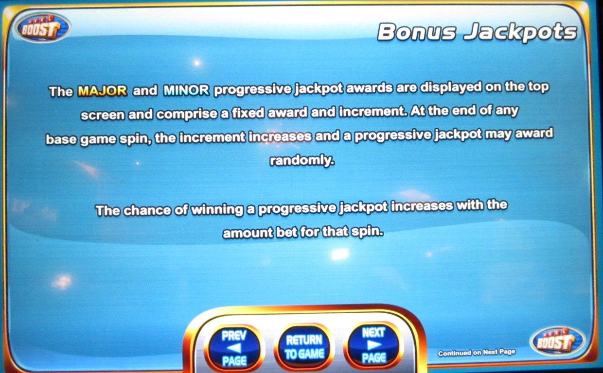 Насколько я понимаю, в играх WMS малый джекпот начинается с 25 долларов и должен быть выигран до достижения суммы в 50 долларов. Большой джекпот начинается с 200 долларов и должен быть выигран до достижения суммы в 500 долларов. Судя по моей собственной игре, темп увеличения счетчика составляет 0,00582 от выигранной суммы.