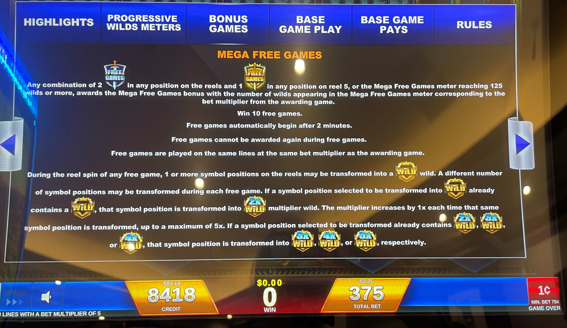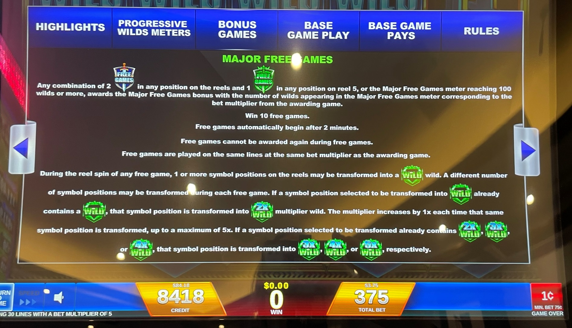 - Символы «Бесплатные игры» появляются на барабанах с 1 по 5. Если игрок получит два таких символа между барабанами с 1 по 4 и еще один на 5-м барабане, он начнет бонусную игру. В правилах игры не указано, что произойдет, если игрок получит три или четыре диких символа на первых четырех барабанах. Возможно, в игре есть ошибка, делающая это невозможным.