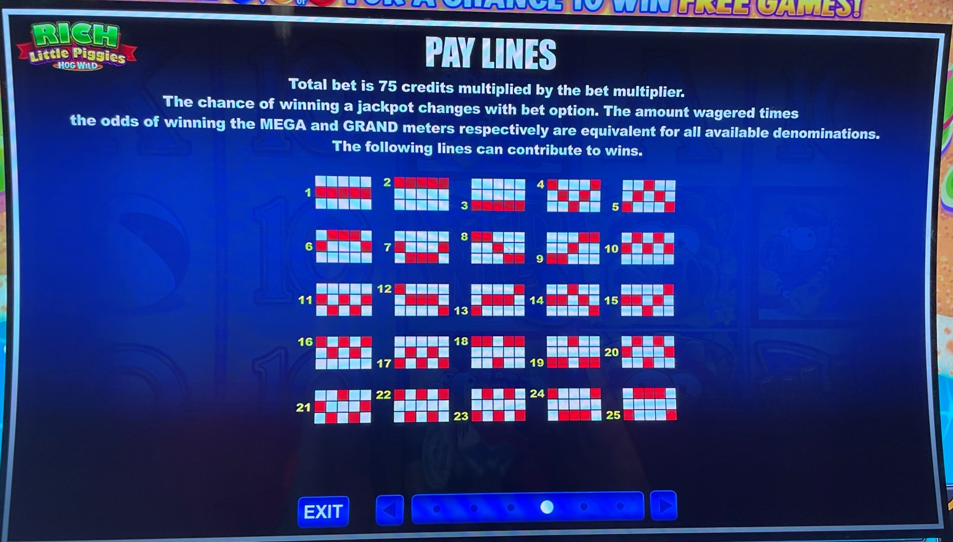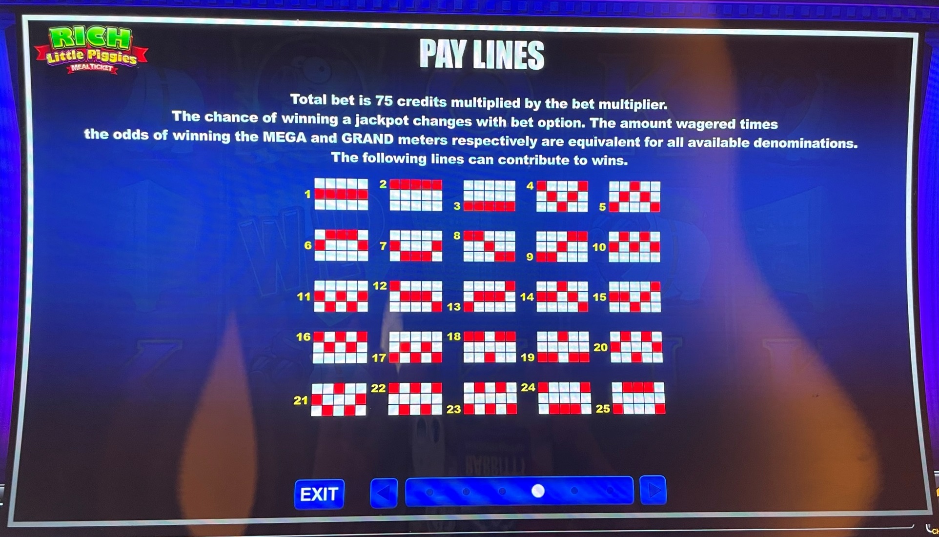 - В игре 25 линий выплат. Разделив общую ставку на 25 линий выплат, получаем, что количество кредитов, поставленных на одну линию выплат, составляет 3, 6, 9, 18 или 24.