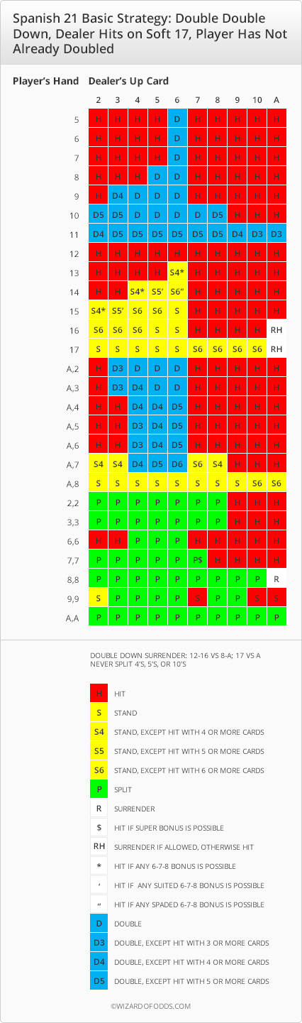 Туз и 10 после разделения тузов выплачиваются 3 к 2 : У меня есть неподтвержденная информация о том, что в свое время казино Meskaki в центральной Айове выплачивало 3 к 2 за туз и 10 после разделения тузов. У меня также есть неподтвержденная информация о том, что с августа 2010 года они полностью убрали стол Spanish 21. По моим расчетам, это снижает преимущество казино на 0,16%. В противном случае они получают «мягкую» 17 и не удваивают ставку, что в сумме дает преимущество казино в 0,60%.