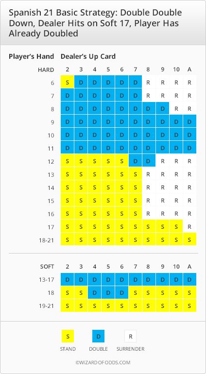 Следующая таблица предназначена для случаев, когда дилер берет карту при мягкой 17, и в этом случае допускается повторное удвоение ставки, а игрок уже удвоил ставку, что ограничивает его возможности: остановиться, сдаться и снова удвоить ставку.