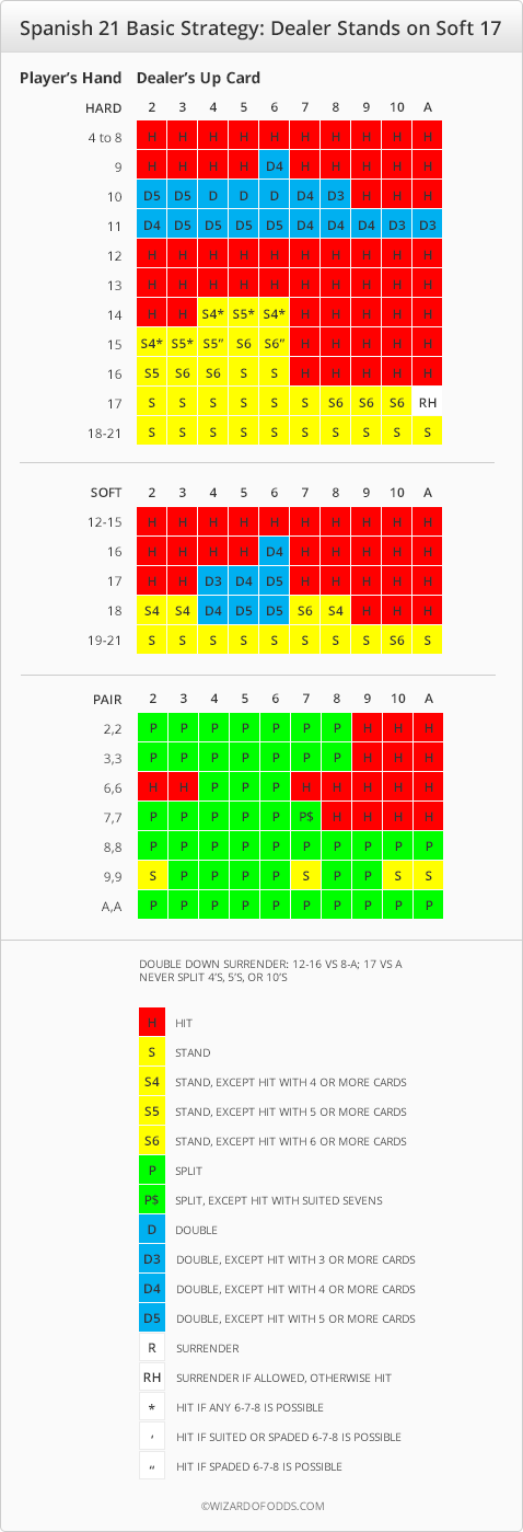 Ниже представлена моя базовая стратегия игры в Spanish 21, когда дилер берет карту при мягкой 17.