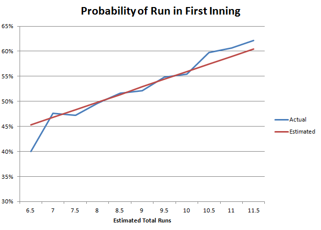 Популярная ставка в бейсболе — на то, будет ли забито хотя бы одно очко в первом иннинге. Совершенно очевидно, что вероятность забитого очка в первом иннинге тесно связана с прогнозируемым общим количеством очков. В следующей таблице показано количество игр, в которых было забито очко в первом иннинге, в зависимости от общего количества очков. Второй столбец, озаглавленный RSFI, означает «Очко, забитое в первом иннинге». Эта таблица основана на сезонах с 2001 по 2011 год. В нижней правой ячейке показана общая вероятность забития хотя бы одного очка в первом иннинге, составляющая 52,5%.