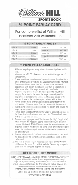 | Уильям Хилл (Северная Невада) | 6.75 | 13 | 26 | 52 | 104 | 208 | 425 | 850 | 1500 | 3000 |