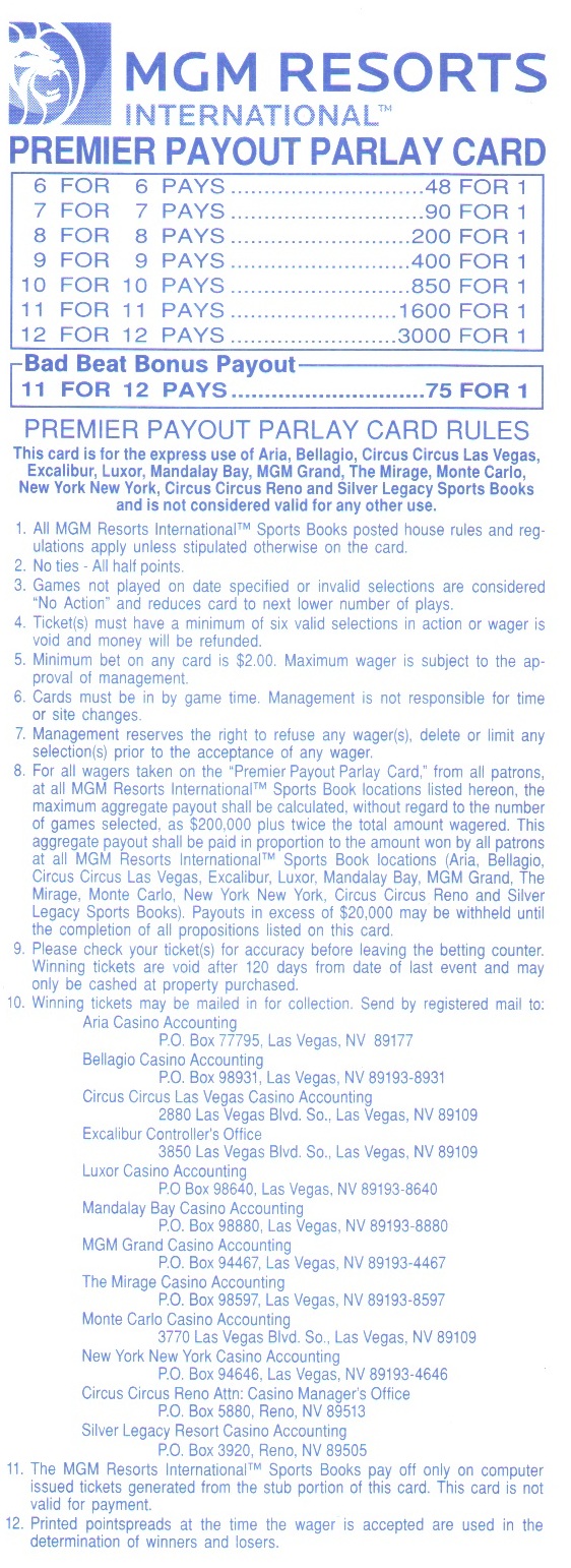 - В экспресс-ставке MGM Pick-12 Premium Payout выплата составляет 3000 за попадание в цель 12 раз, а за попадание в цель 11 раз — 50 за «неудачную раздачу». Подробнее об этом ниже .