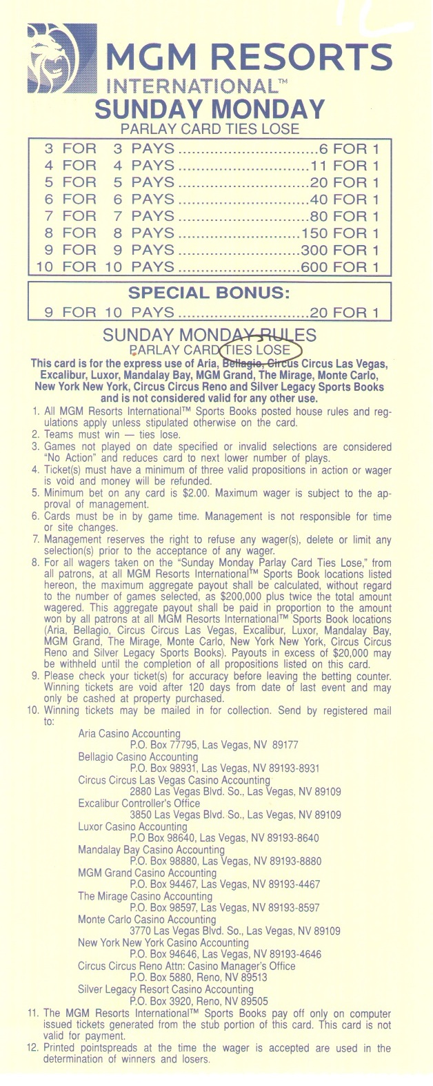 В следующей таблице показаны выплаты по экспресс-ставкам с 50% в различных букмекерских конторах Лас-Вегаса. Выигрыши в этой таблице рассчитываются по принципу «за один бросок». Другими словами, первоначальная ставка не возвращается, даже если ставка выигрывает. Если бы меня заставили выбрать лучшую, я бы сказал, что это William Hill, у которого лучшие или равные лучшие выплаты по всем количествам бросков, кроме 10 и 12. В этих случаях лучшей является экспресс-ставка MGM Premium Payout .