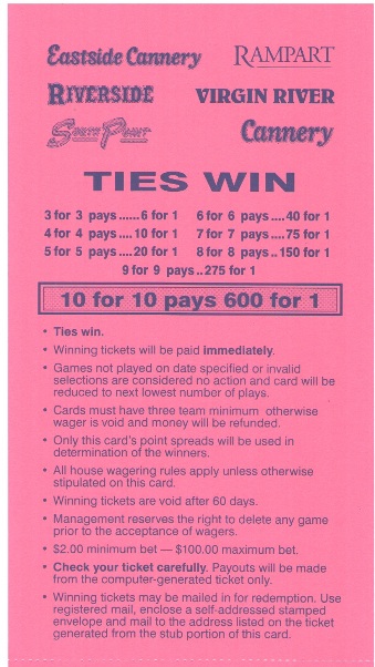Эта таблица показывает, что в Jerry's Nugget самые выгодные коэффициенты на экспресс-ставки вне табло. Помимо удобства, нет никаких причин делать экспресс-ставки вне табло где-либо ещё в Вегасе.