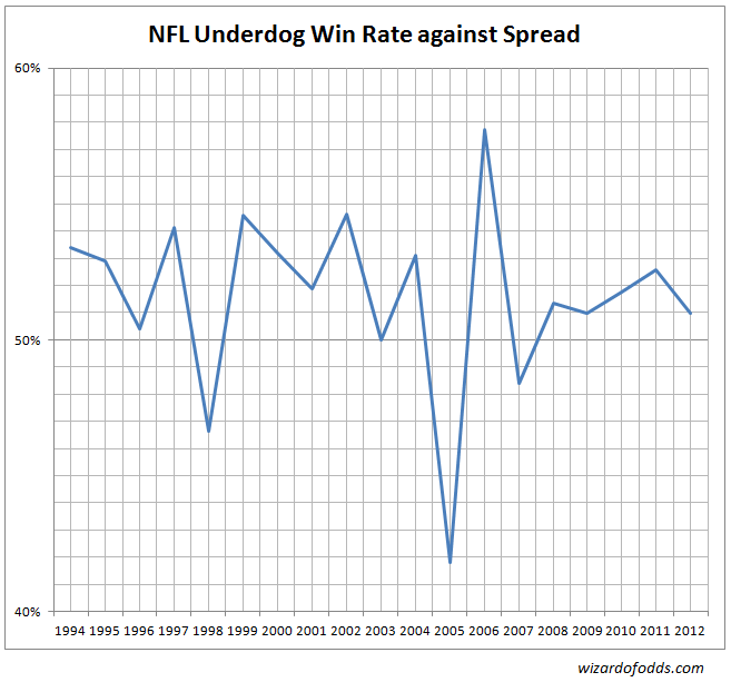 Ещё один совет, и это самый важный совет, когда речь идёт о ставках на спорт, — ставьте на аутсайдеров ! С 1994 года 51,6% ставок на аутсайдеров выигрывали с учётом форы в завершённых играх. Если вы считаете, что эта тенденция закончилась, в следующей таблице показан процент выигрышей аутсайдеров с учётом форы по годам.