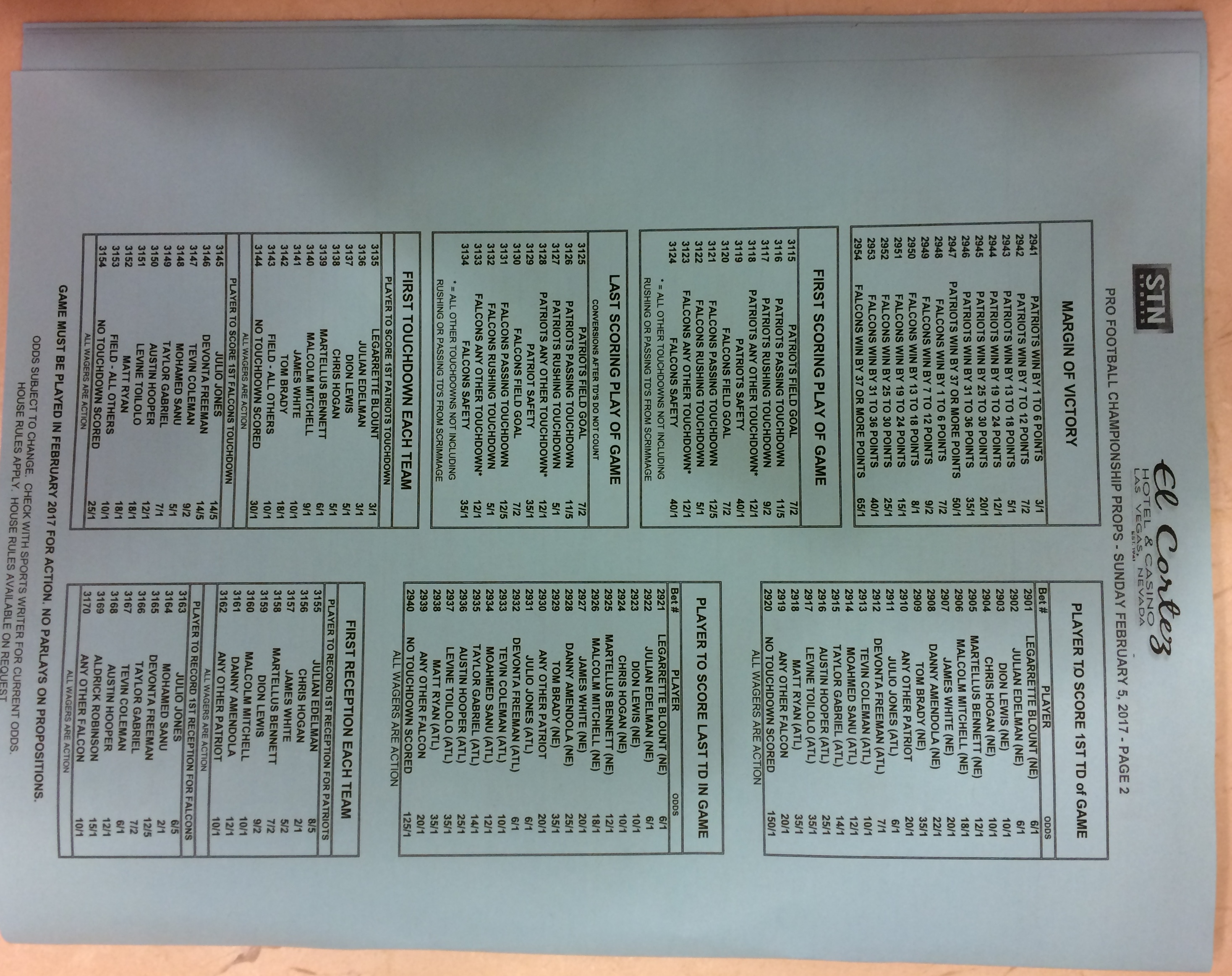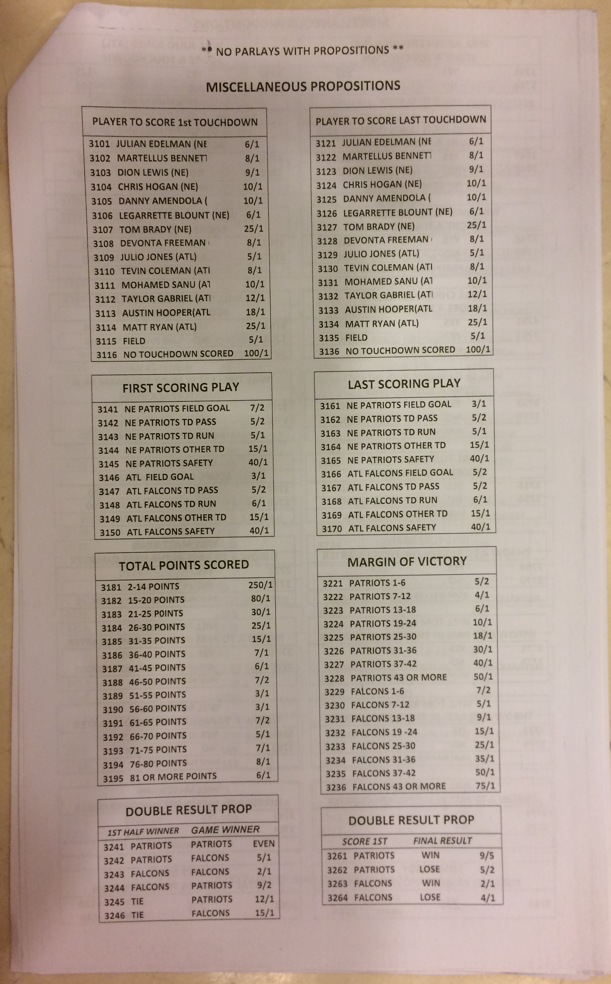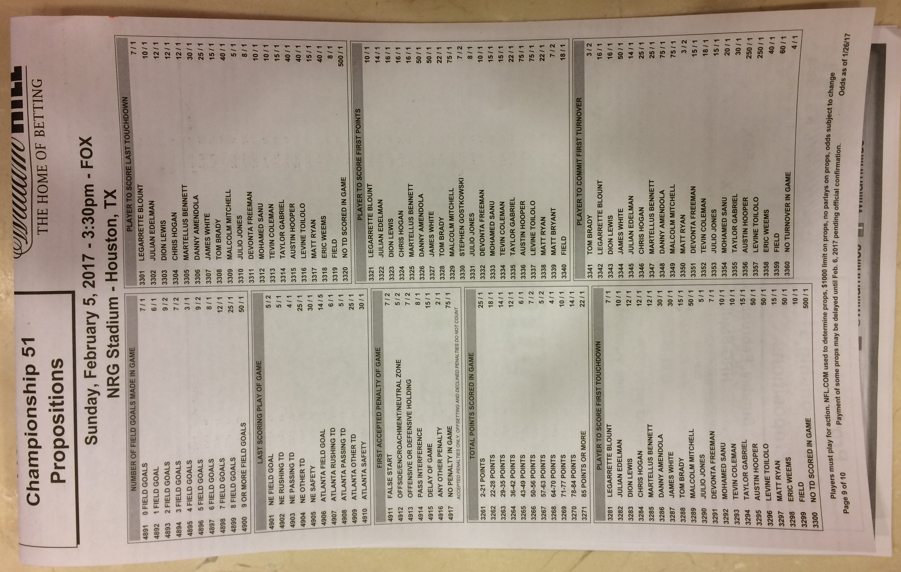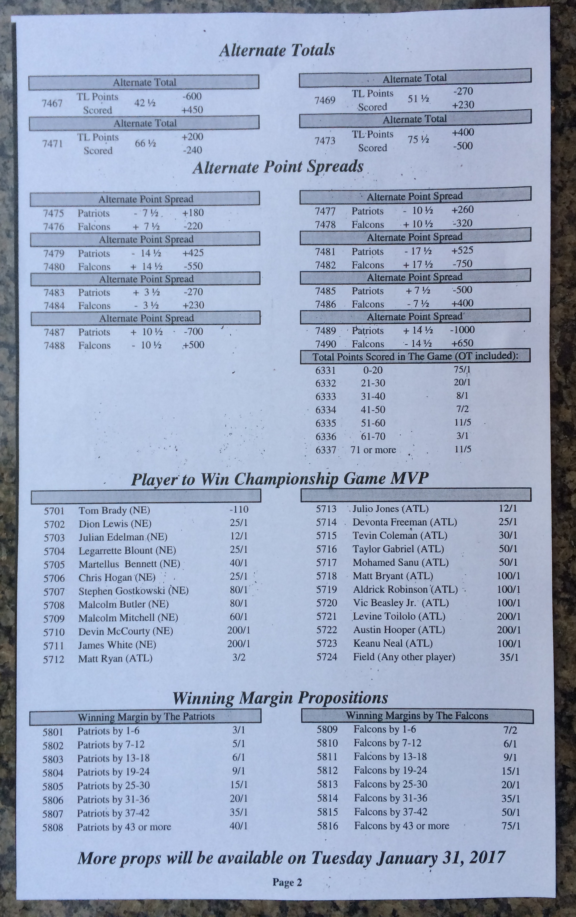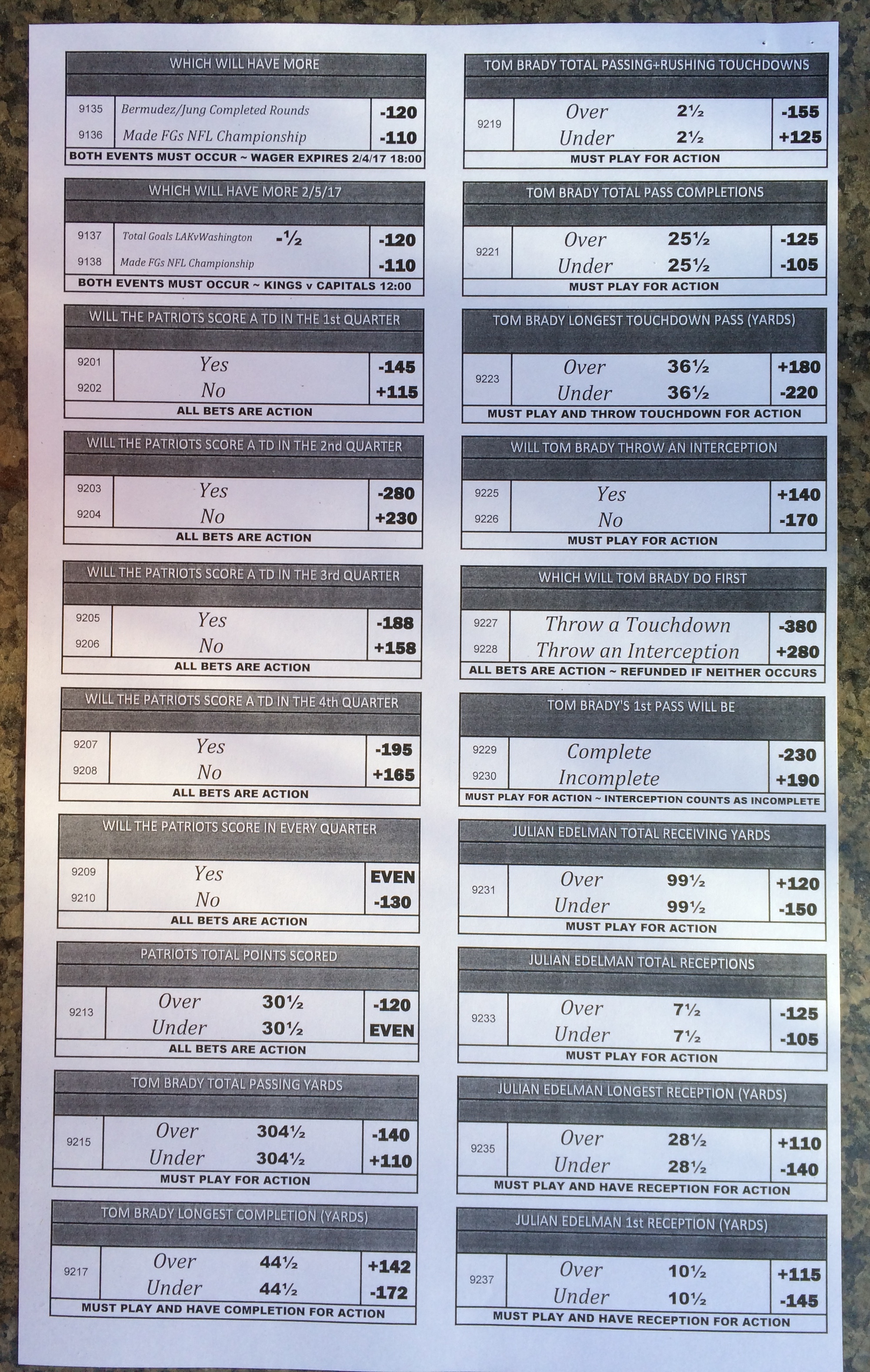 Хотя в этом году я не буду давать вам никаких прогнозов, вы хотя бы можете посмотреть, что есть в наличии. Вот несколько фотографий списков ставок на Супербоул 51. В дни, предшествующие игре, должно появиться больше вариантов.