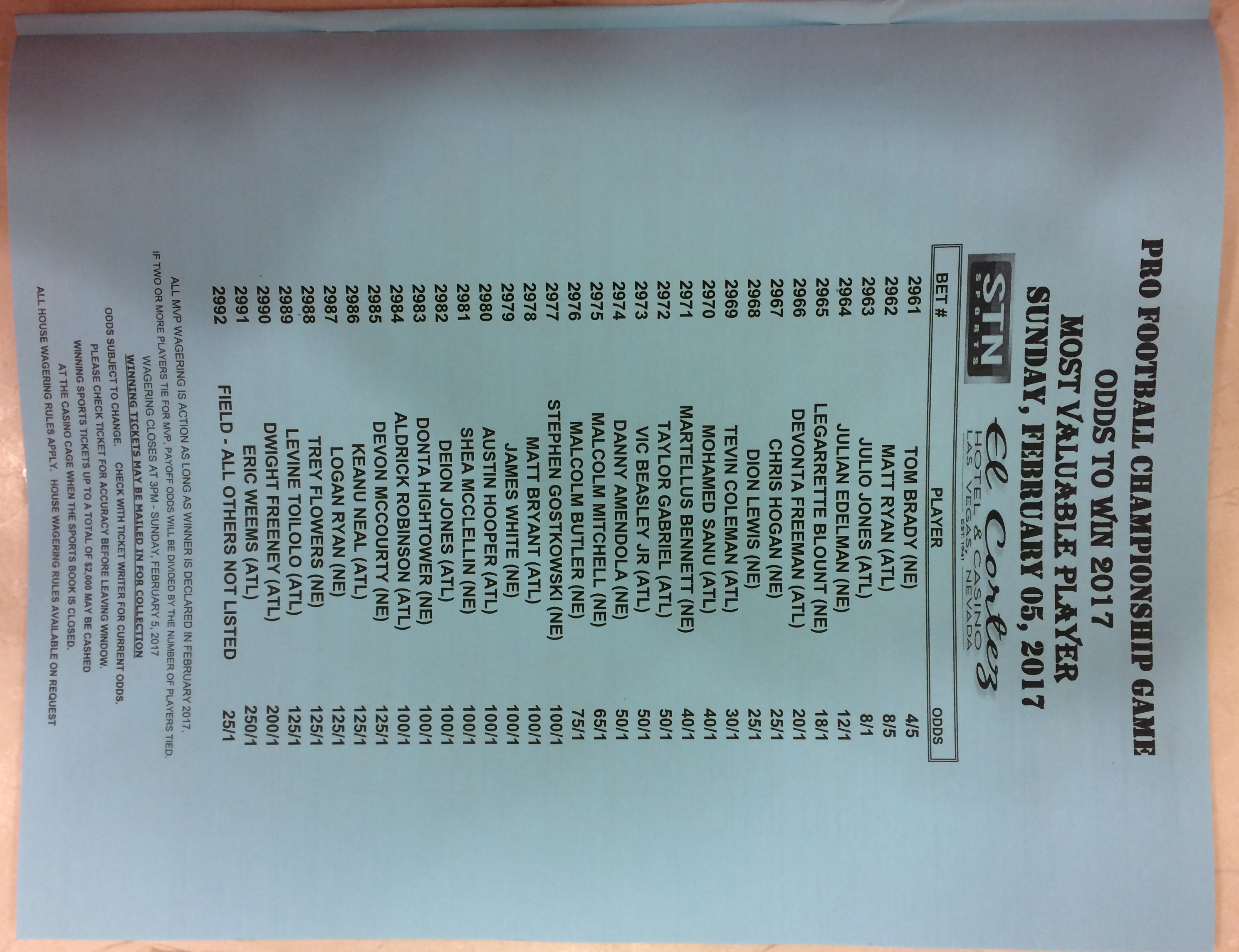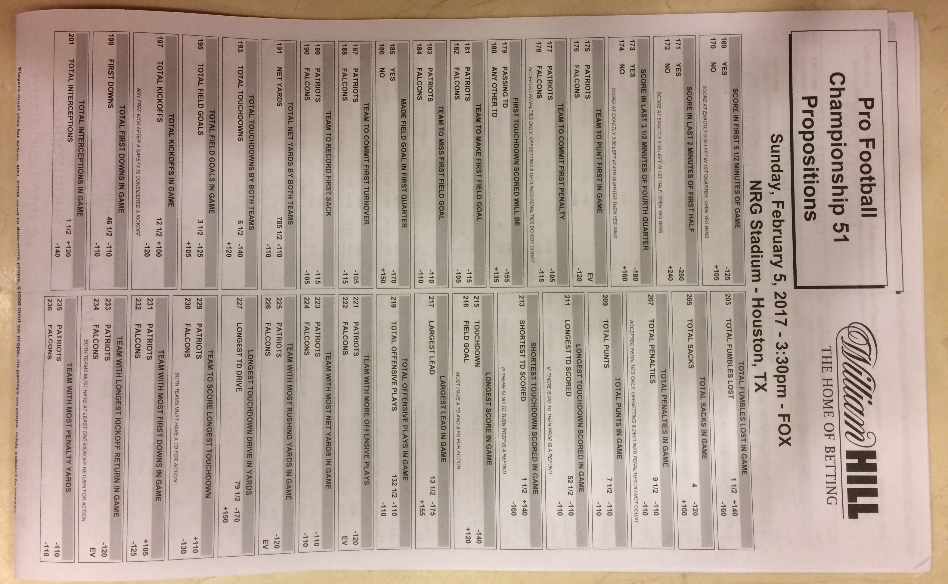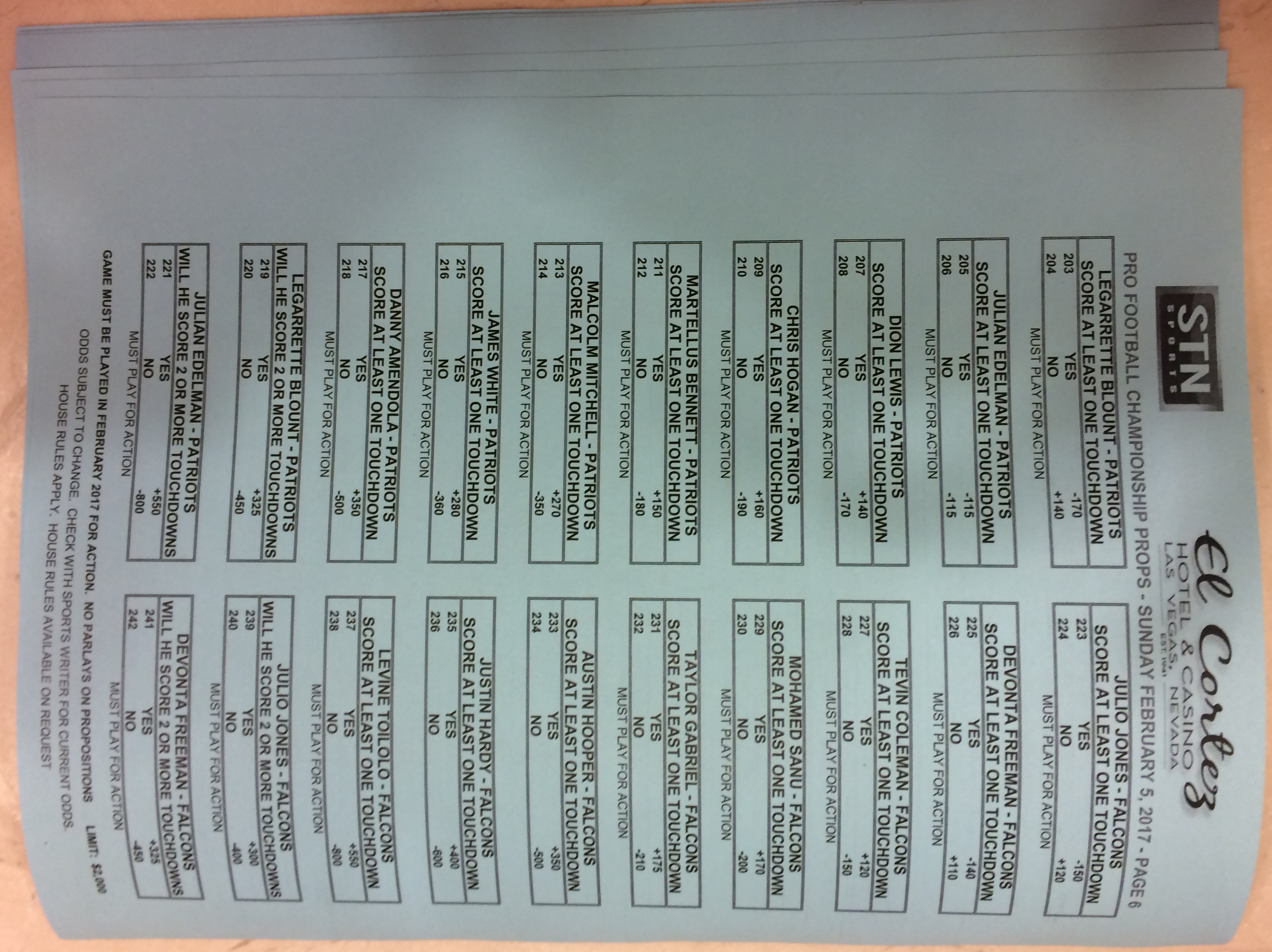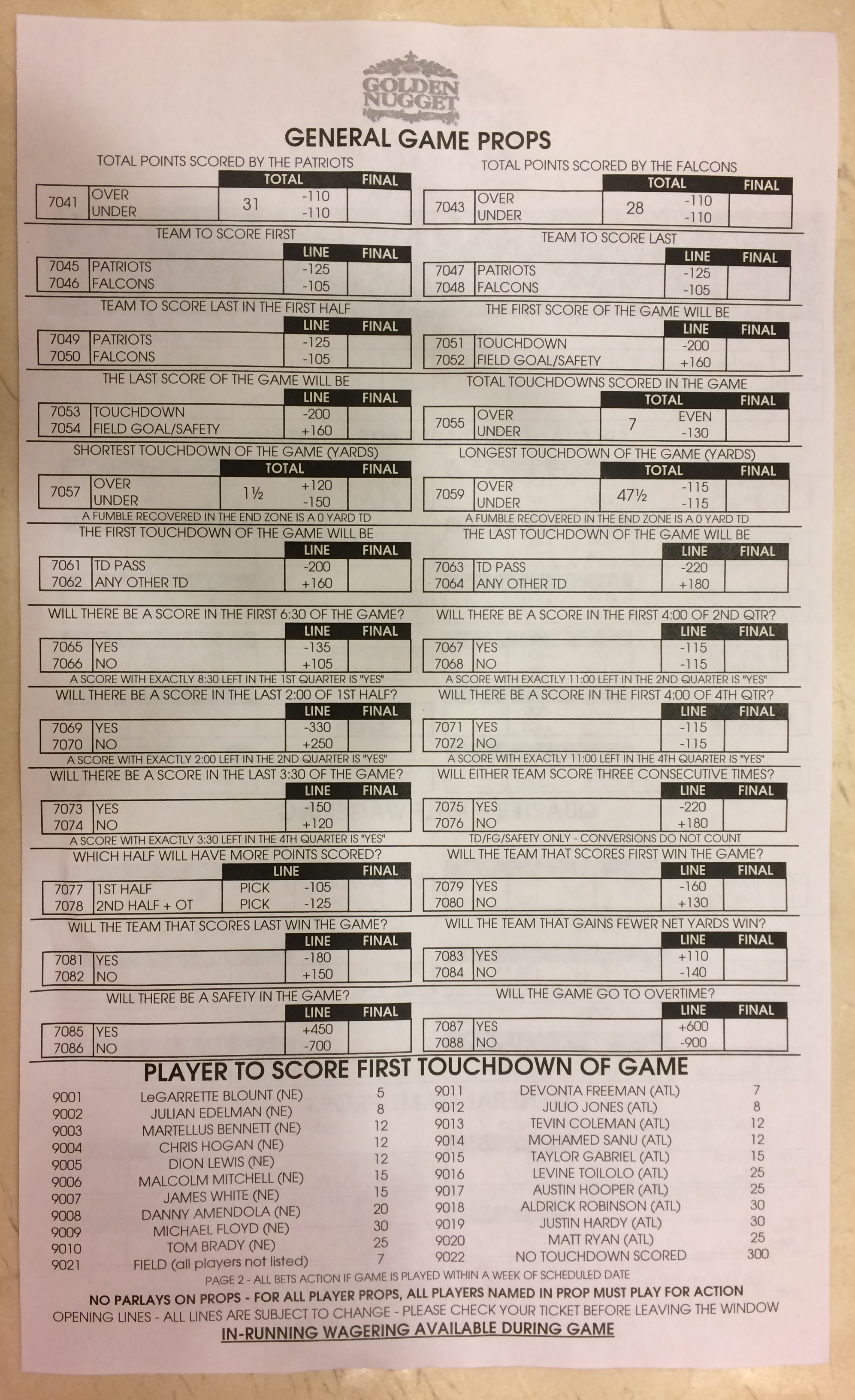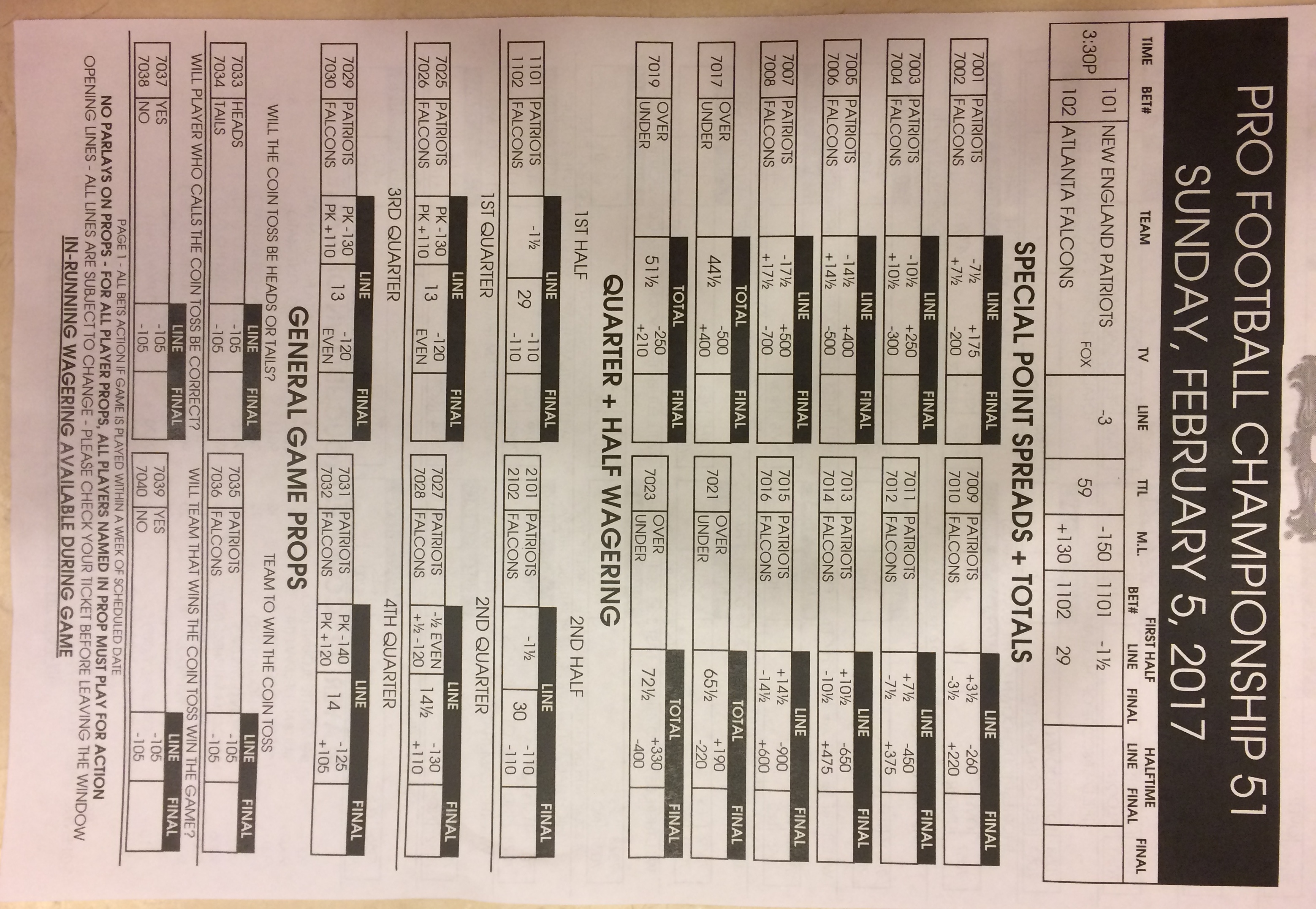 Хотя в этом году я не буду давать вам никаких прогнозов, вы хотя бы можете посмотреть, что есть в наличии. Вот несколько фотографий списков ставок на Супербоул 51. В дни, предшествующие игре, должно появиться больше вариантов.